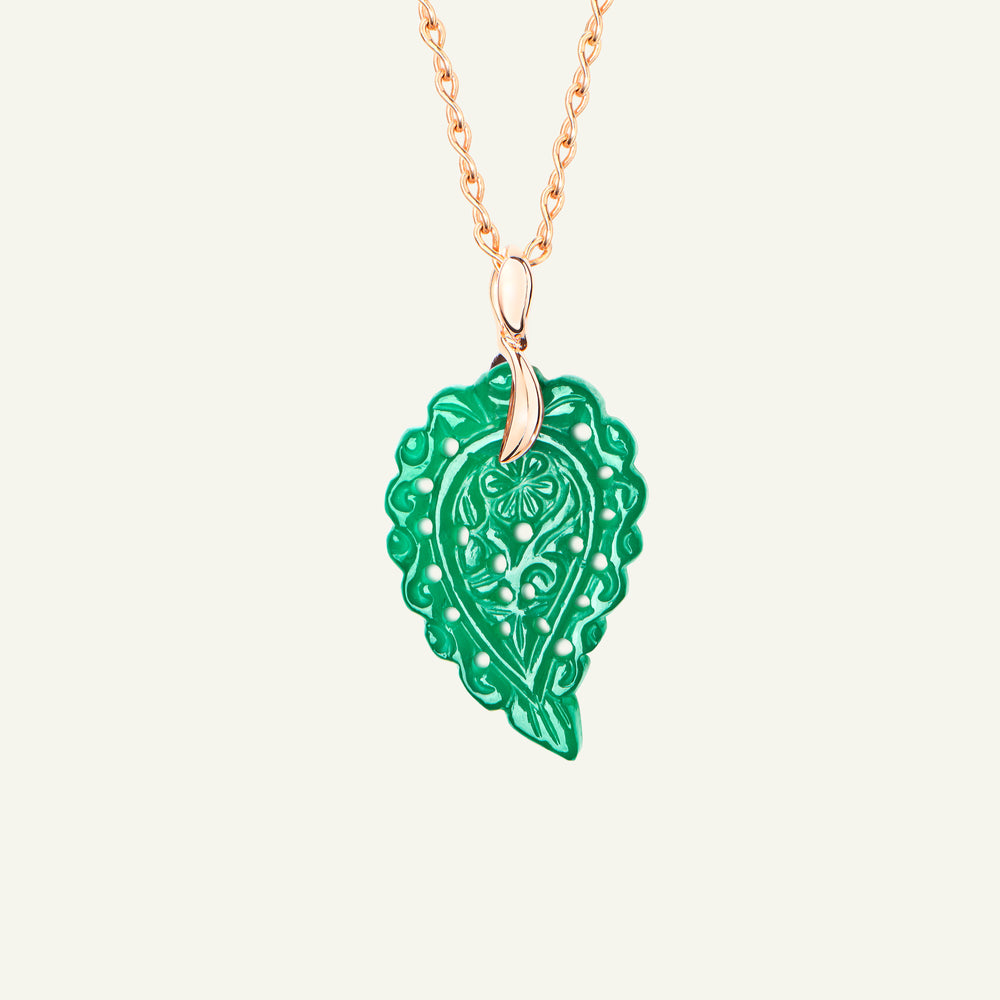 The INDIA Small Pendant in 18K gold features artfully carved green Onyx, showcasing a rich, vivid green hue in an elegant leaf shape. Designed to dangle delicately from a chain, it’s a beautiful everyday favorite that adds a touch of sophistication to any look. Perfect for adding dimension to a layered look.