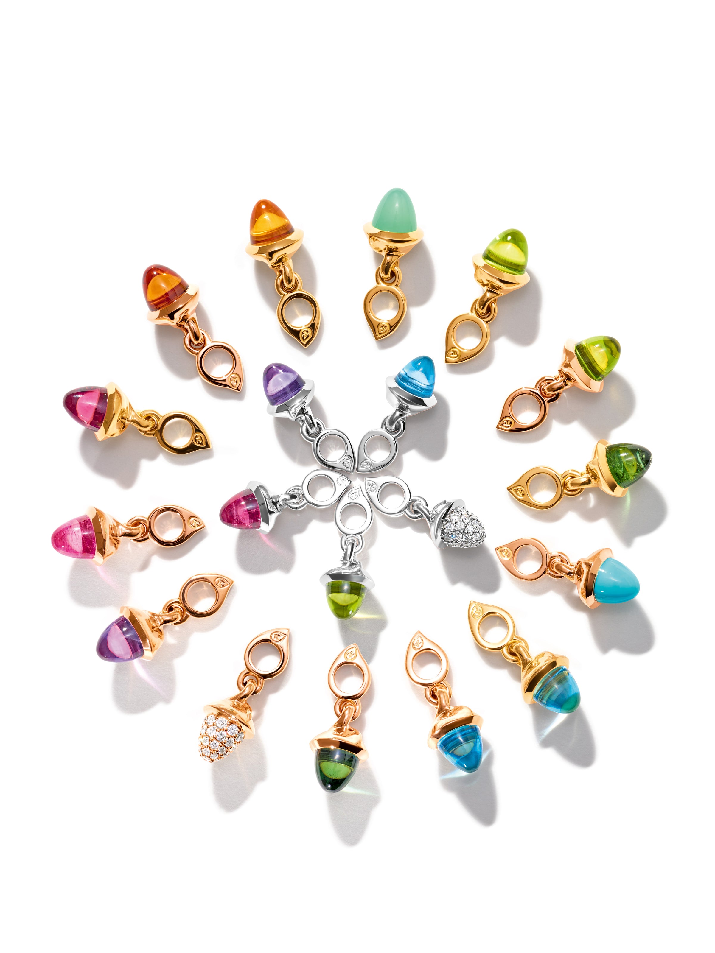 The collection that started it all: MIKADO embodies the vibrant, colorful world of gemstones with over 30 different gemstone pendants – in a distinct acorn shape – and an array of sizes.