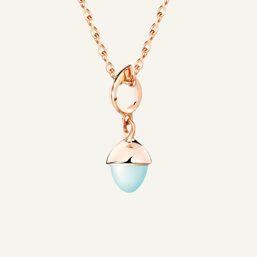 The iconic MIKADO Flamenco Pendant with Aqua Chalcedony features a beautiful blue-green gemstone that gracefully dangles from a delicate water drop charm, all set in 18K gold. Its elegant and timeless design adds a touch of charm to your collection. Ideal for mix & match styling, collecting, and gifting.