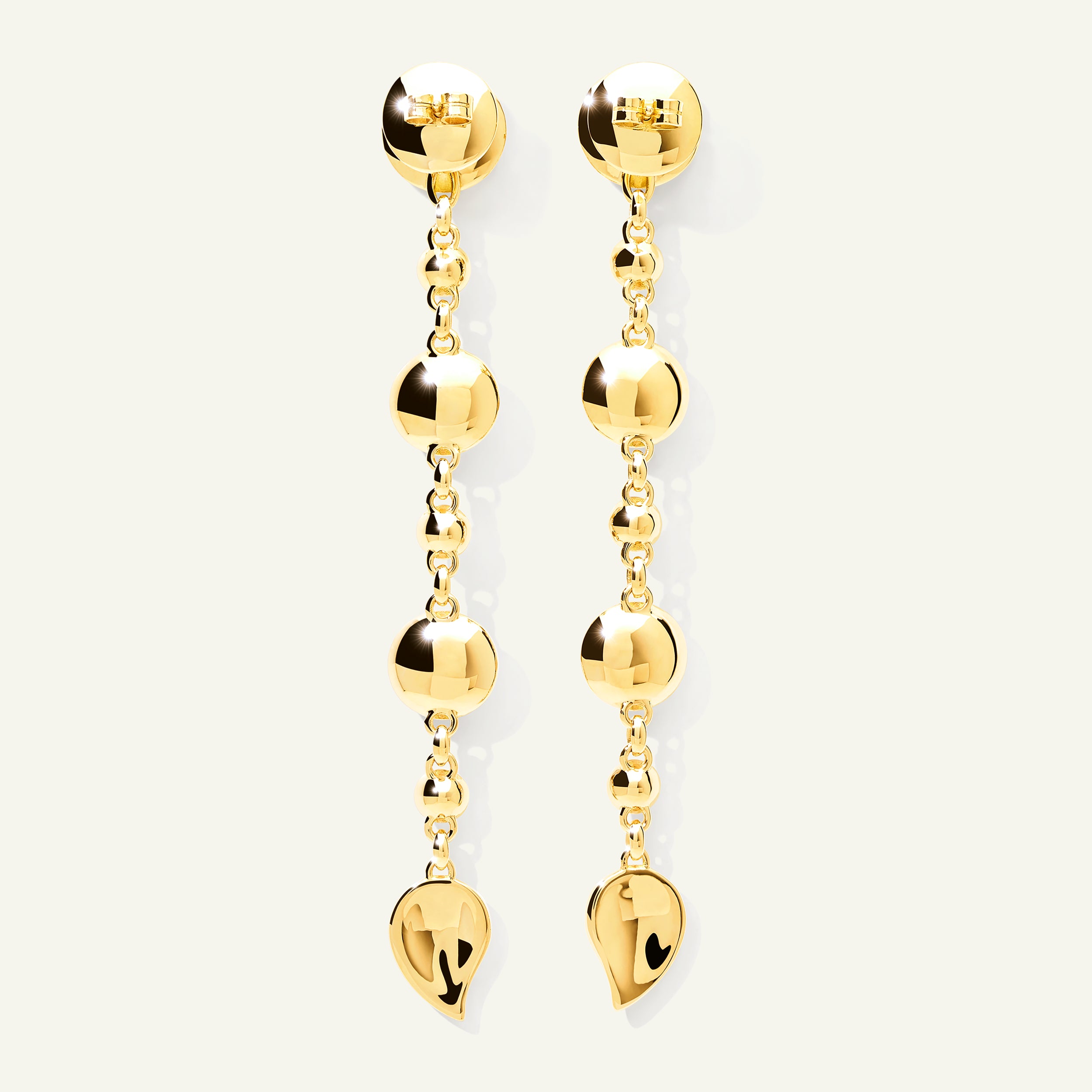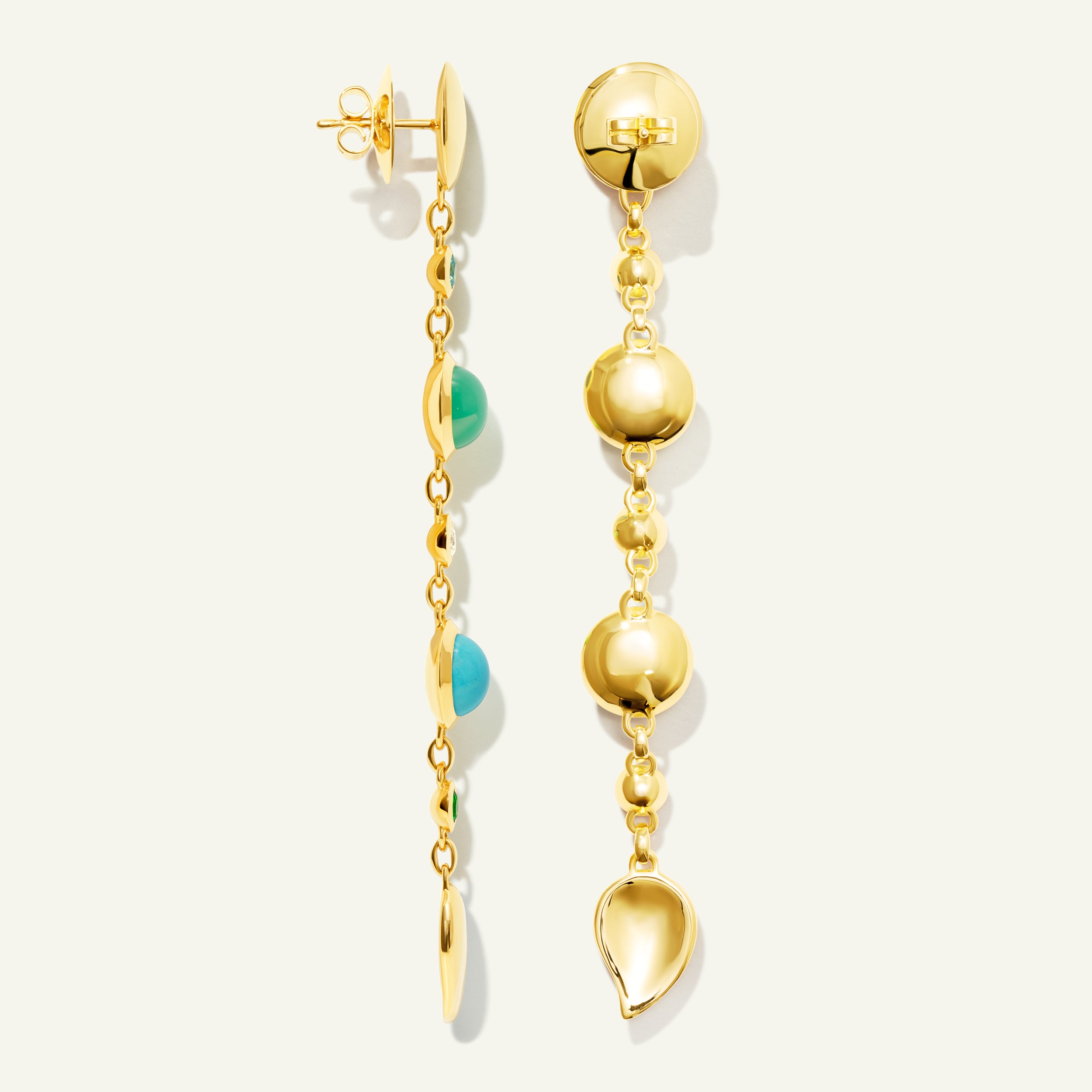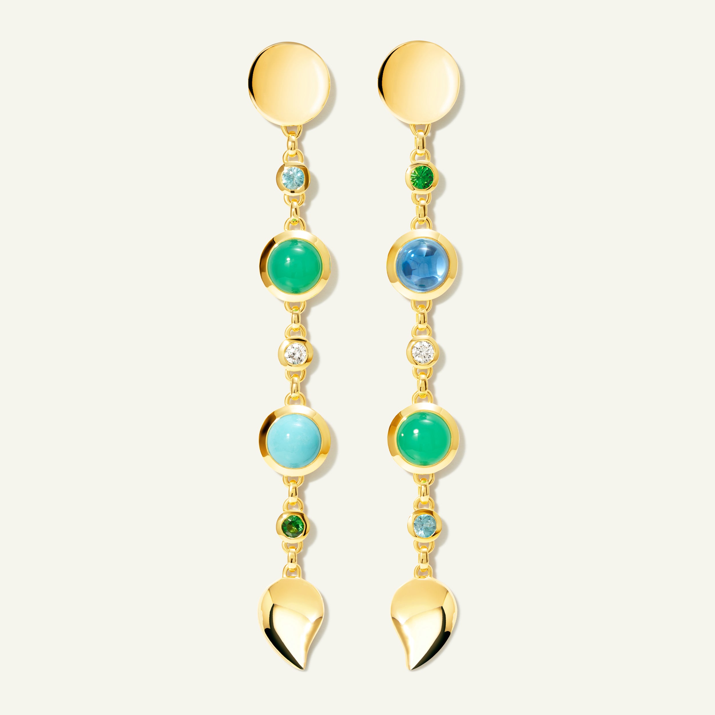 The BOUTON Long Earrings in 18K gold showcase the beauty of the ‘Lagoon’ Color Story, combining dreamy blue and green cabochon-cut stones with vibrant diamonds. Designed to flow gracefully with every movement, these striking earrings create a cascade of color along the ear. A delicate water drop detail completes the look, accentuating the feminine elegance of this true statement piece.