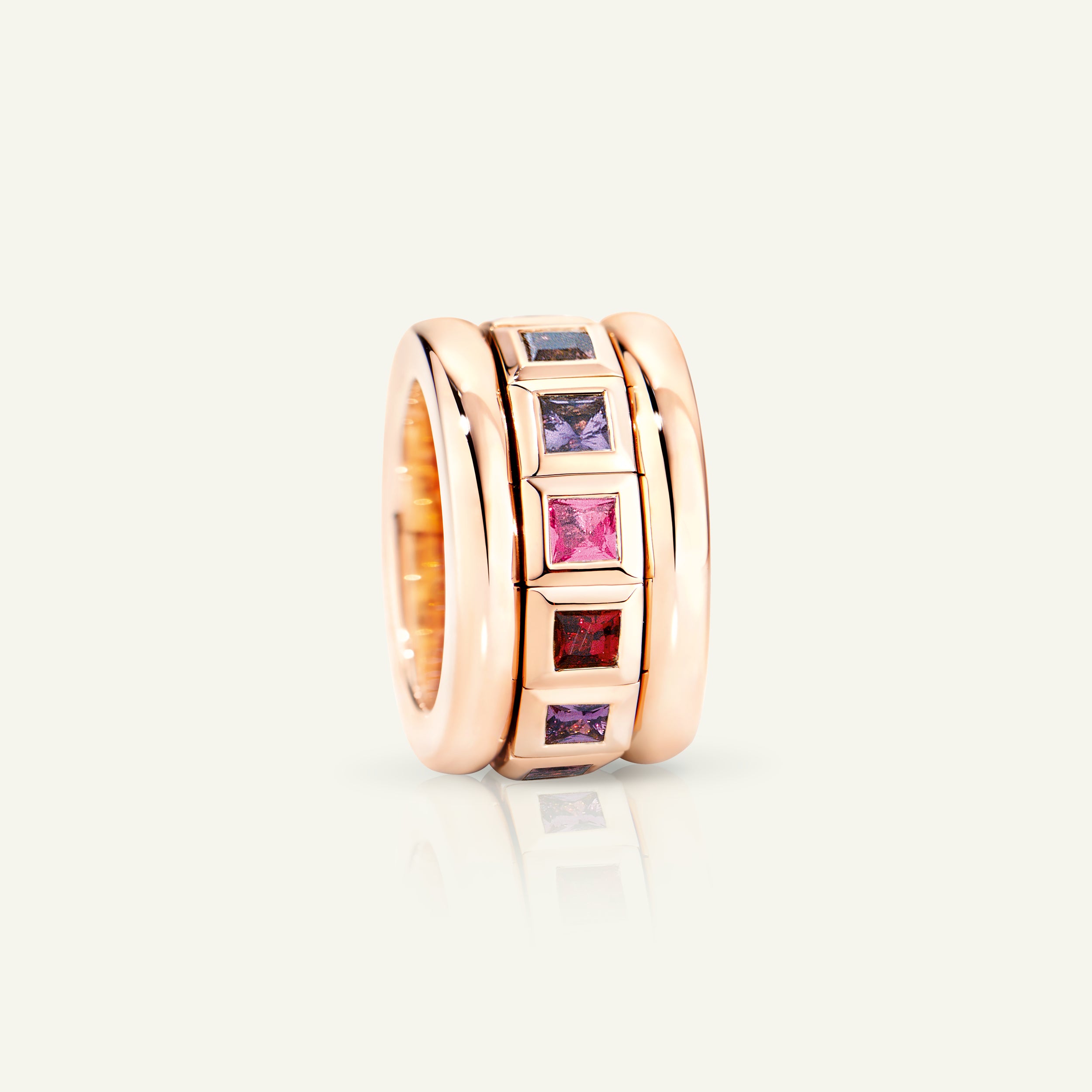 A truly iconic piece, the CURRICULUM VITAE Ring is a masterpiece of modern design. Featuring sliding princess-cut precious stones in the ‘Wildberry’ Color Story, set in 18K gold, each diamond is meticulously arranged to sparkle from every angle. Contemporary yet timeless, this exceptional ring embodies pure artistry and elegance.