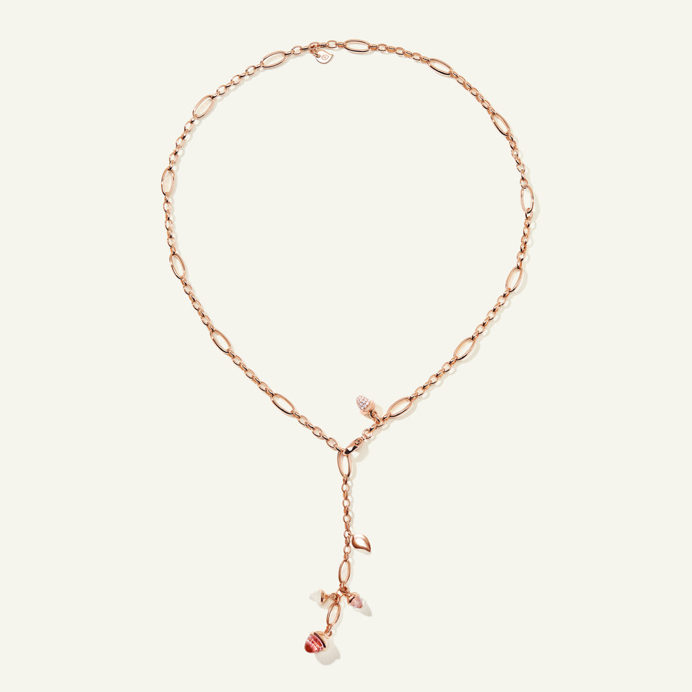 The MIKADO Delicate Necklace in ‘Blush’ features acorn-shaped pendants in soft shades of pink, sand, and white. Delicate water drop elements and a sparkling Diamond Pavé pendant dance along the handcrafted 18K gold chain. The adjustable length makes it a versatile piece for any occasion.