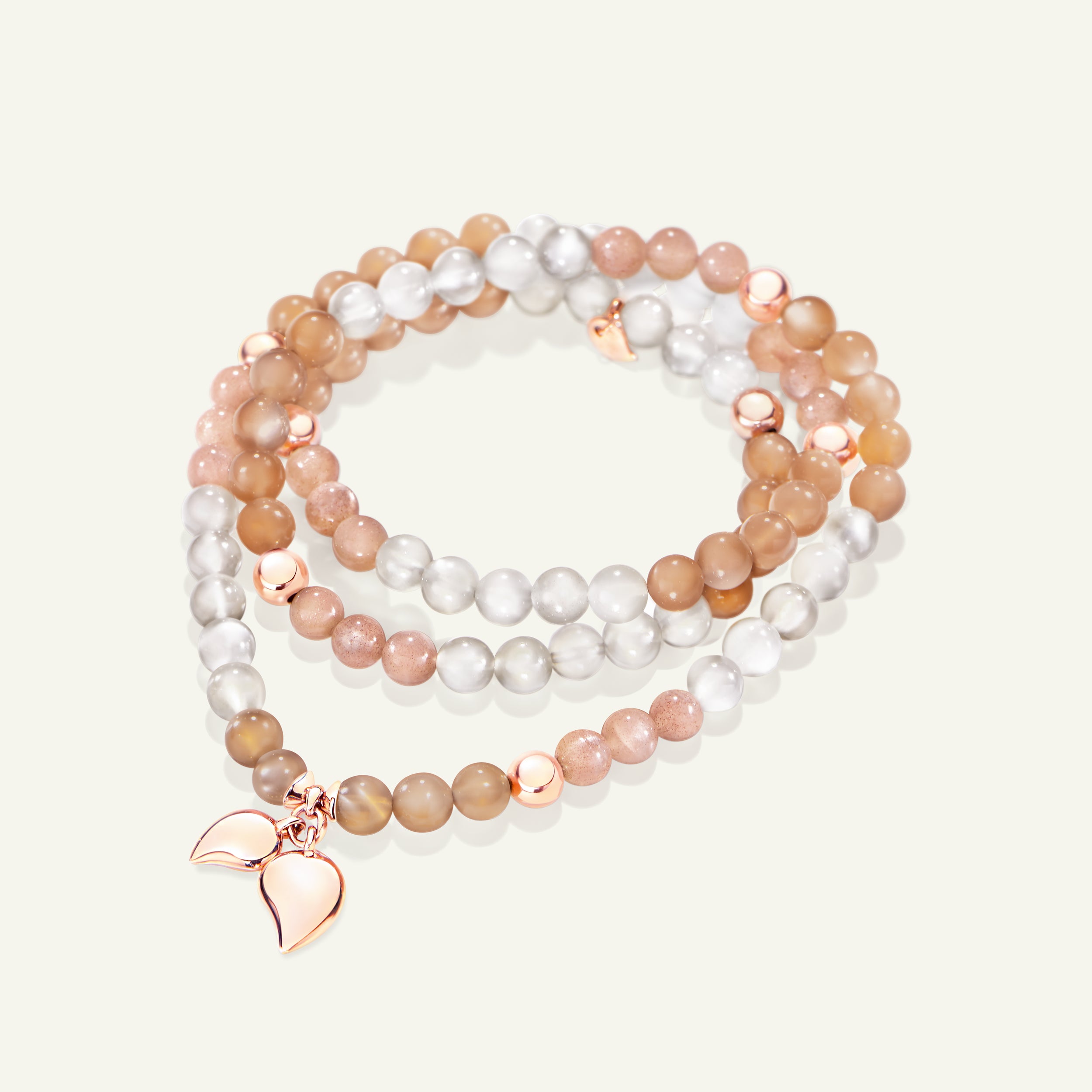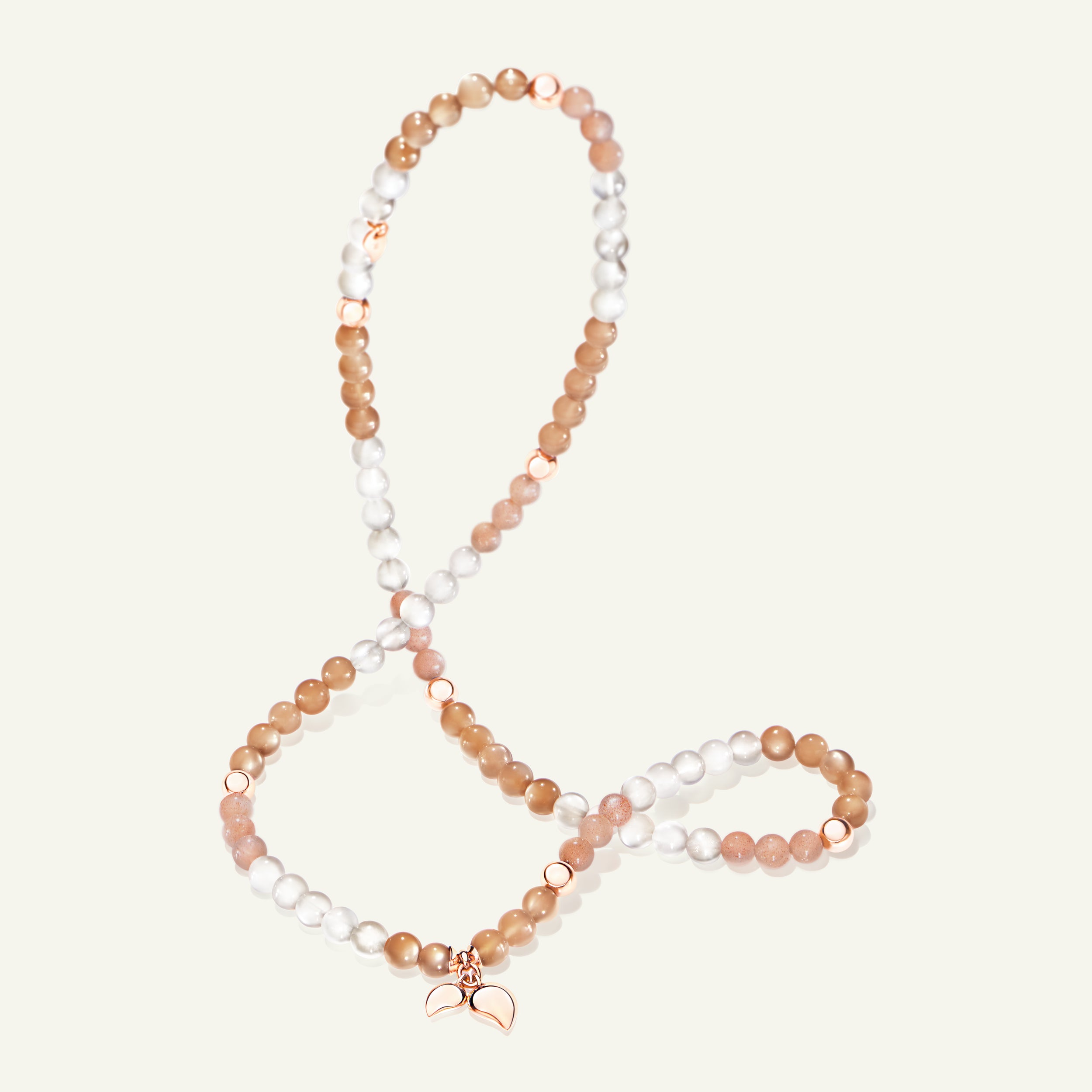 The INDIA Small Bracelet in the ‘Camel’ Color Story features Moonstone gemstones in warm, earthy shades, accented with 18K gold elements and two dangling drop charms. Strung on elastic for a comfortable fit, this triple-wrap design can also be worn as a necklace, offering versatile style and natural elegance.