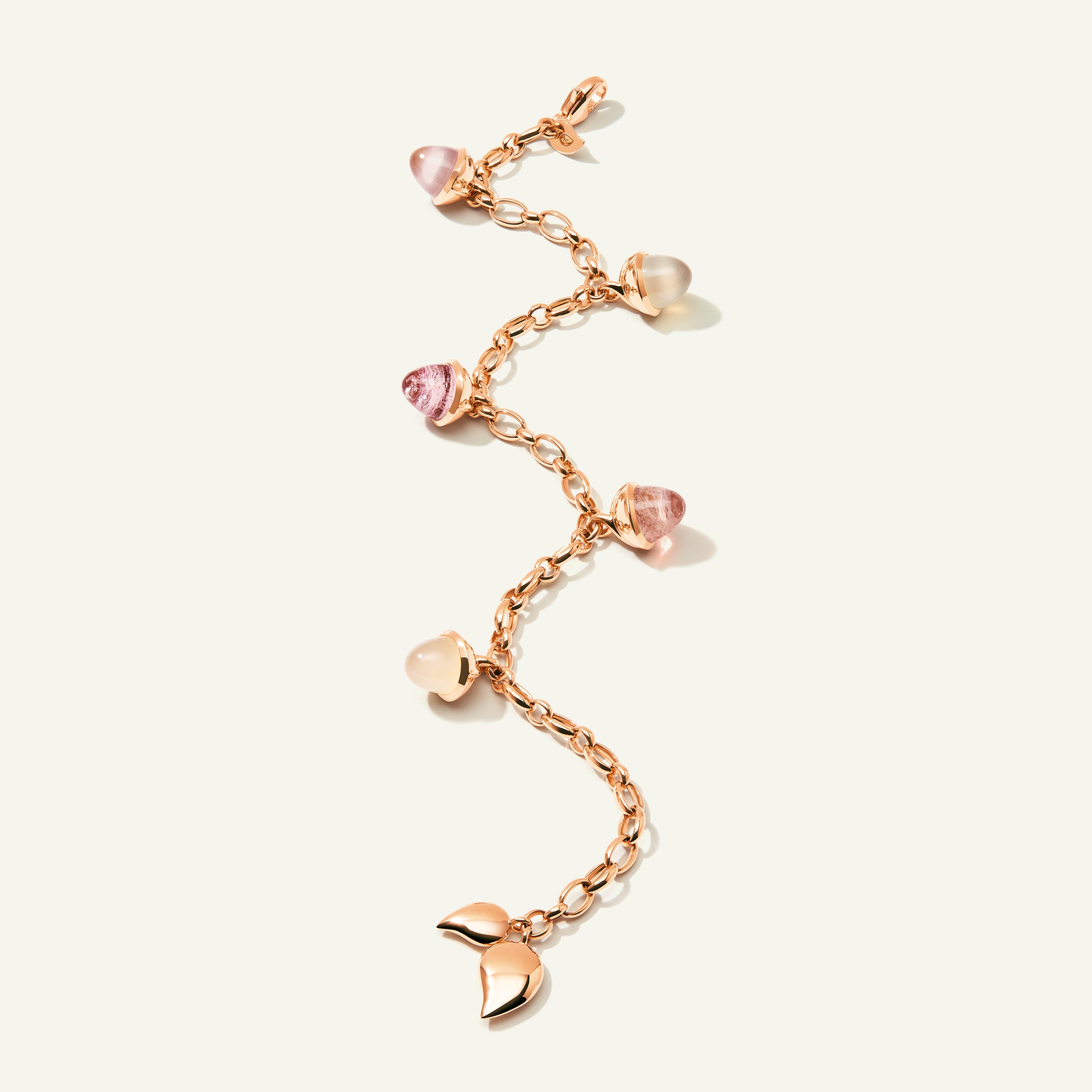 Step into a world of radiant elegance with the MIKADO Flamenco Charm Bracelet in ‘Blush,’ a graceful celebration of soft, feminine hues. Five acorn-shaped gemstones and delicate water drop elements, inspired by the passion and energy of Flamenco dance, shine from a handcrafted 18K gold chain. Designed to add a touch of romance and timeless beauty to your style, season after season.