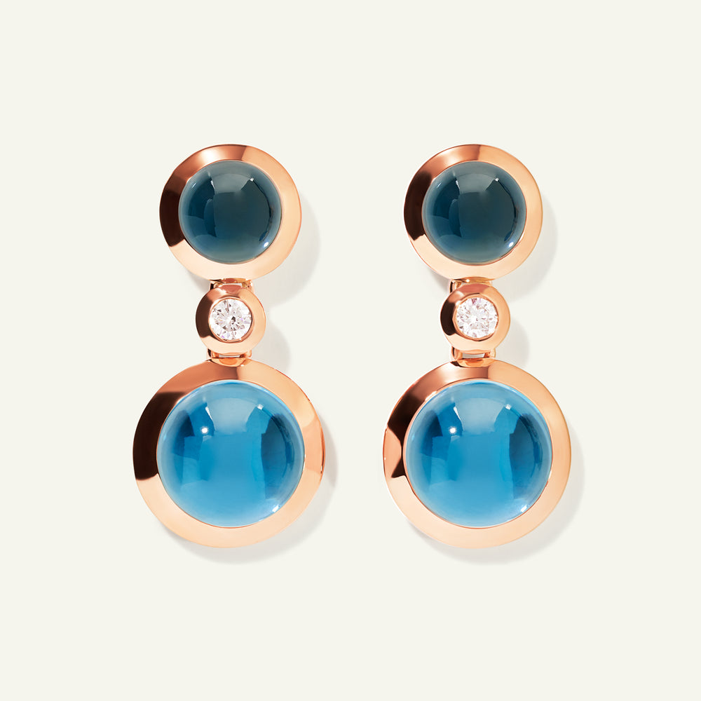 The BOUTON 2 Cabochons Earrings in 18K gold showcase the airy blues of the ‘Sky’ Color Story, pairing radiant London Topaz with vibrant Swiss Topaz. Connected by a delicate white Diamond, these refined earrings adorn the ear with exceptional craftsmanship and light detail, bringing a fresh touch of color to any look.