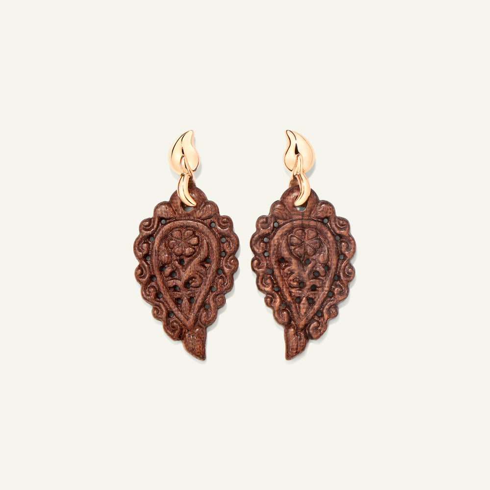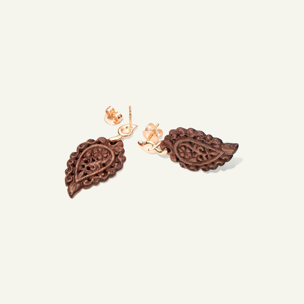 Meticulously handcrafted, the INDIA Earrings in 18K gold feature artfully carved Snakewood leaves, showcasing rich natural patterns that frame the face beautifully. Suspended from an iconic drop-shaped stud, these lightweight earrings bring a touch of organic elegance.