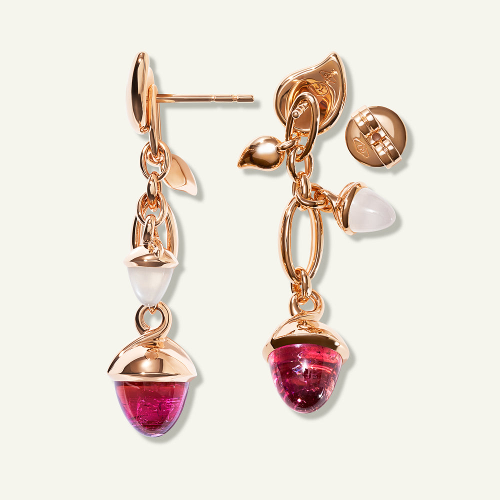 Celebrate individuality with the MIKADO Dangling 2 Acorn Earrings, designed to be worn as elegant drops, refined studs, or as pendants on a chain. Handcrafted in 18K gold, the design’s water drop accents add a signature touch. The feminine 'Blush' Color Story pairs pink gemstones with petite white moonstone for a look that feels both romantic and effortlessly chic.