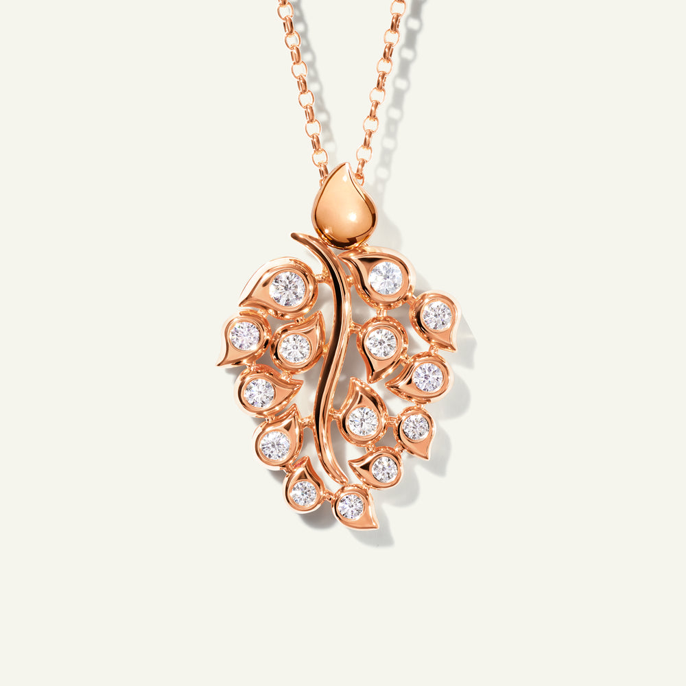 The SNOWFLAKES Leaf Pendant in ‘Indian Summer’ glows with golden yellows, fiery oranges, and deep red gemstones on one side and brilliant white diamonds on the other, all set in 18K gold. Worn on a long chain or a casual leather cord, this pendant is versatile - an elegant choice for everyday luxury and special occasions.