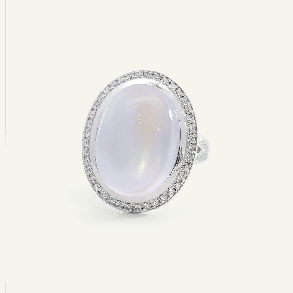 An iridescent Rainbow Moonstone shimmers at the center of the CUSHION Ring, revealing flashes of color with every movement. Accented by Diamond Pavé along the mounting and band, the tapered cushion-style design balances luminous beauty with refined elegance and comfort.