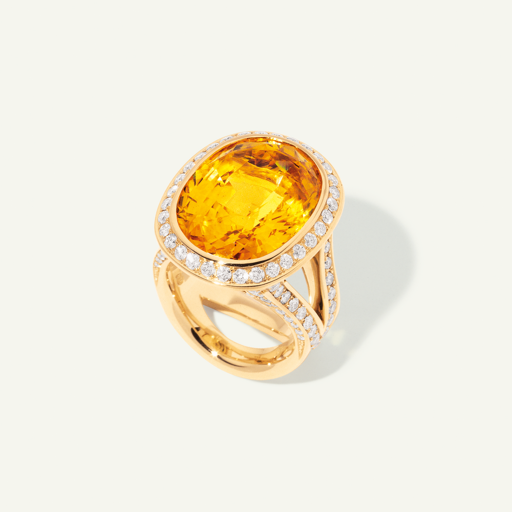 Mit einem ovalförmigen gelben Saphir (22,82 ct) und ca. 2,0 ct Diamant-Pavé (F/VS). Goldgewicht ca. 21,0 g.