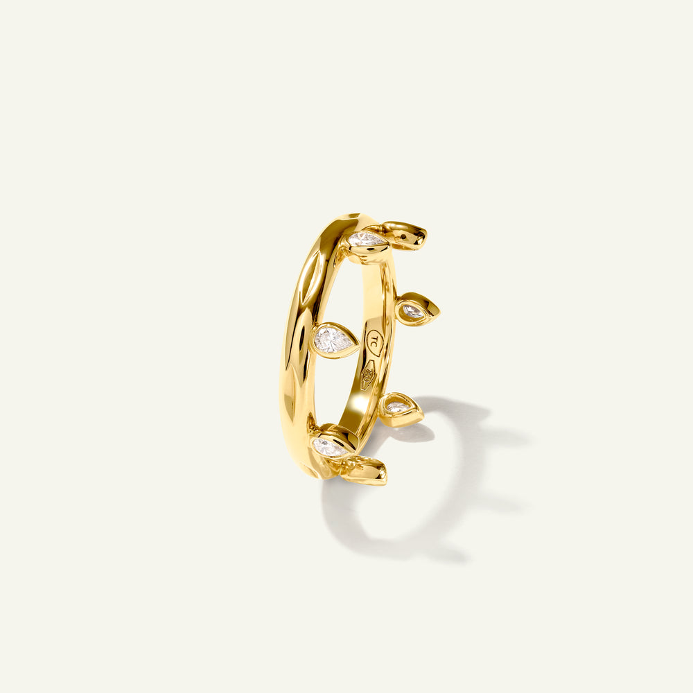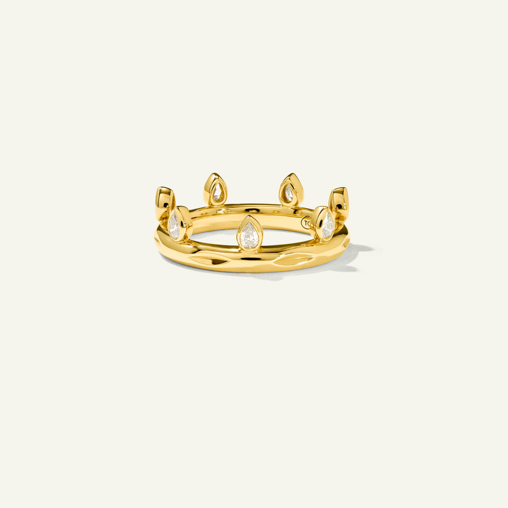 The GYPSY Crown Ring in ‘Classic’ is an elegant expression of timeless design. Crafted in 18K gold, it glimmers with drop-cut white diamonds set along the crown-shaped band. With gemstones positioned on the sides, this design offers a striking silhouette and endless styling possibilities. As versatile and unique as the person who wears it, this ring is made to be collected, stacked, and cherished.