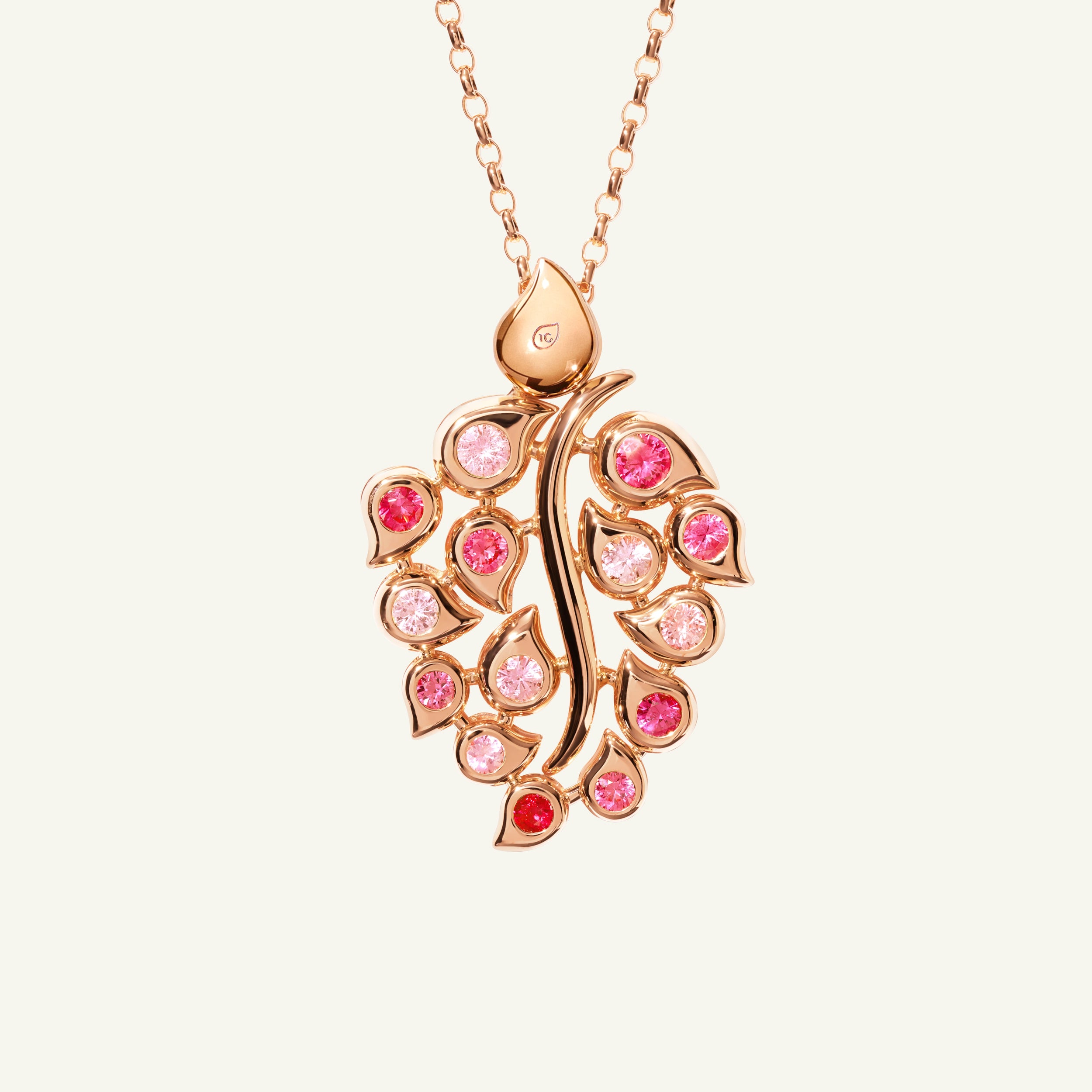 The SNOWFLAKES Leaf Pendant in ‘Blush’ sparkles with pink sapphires on one side and brilliant white diamonds on the other, all set in 18K gold. Worn on a long chain or a casual leather cord, this pendant is versatile - an elegant choice for everyday luxury and special occasions.