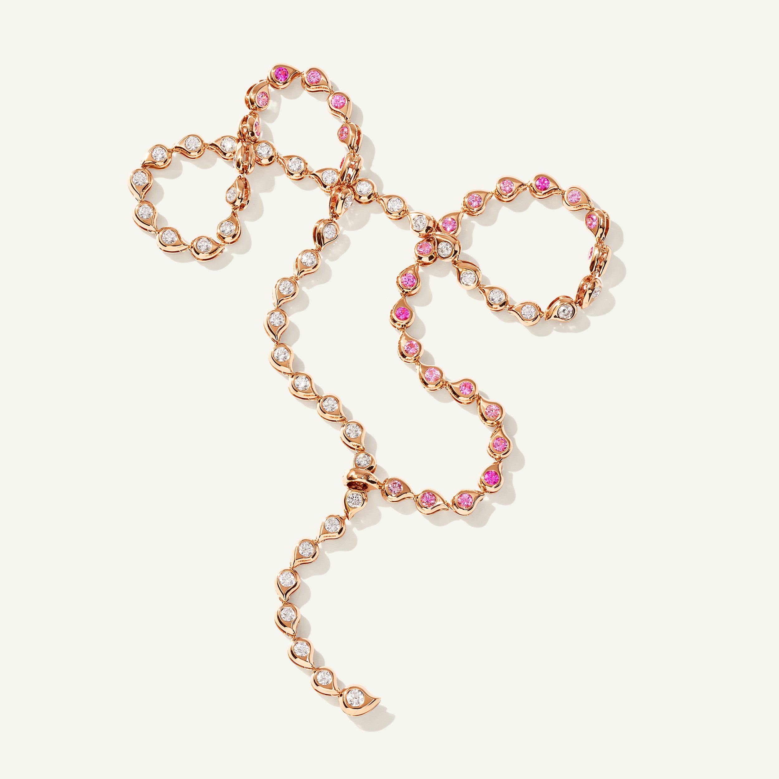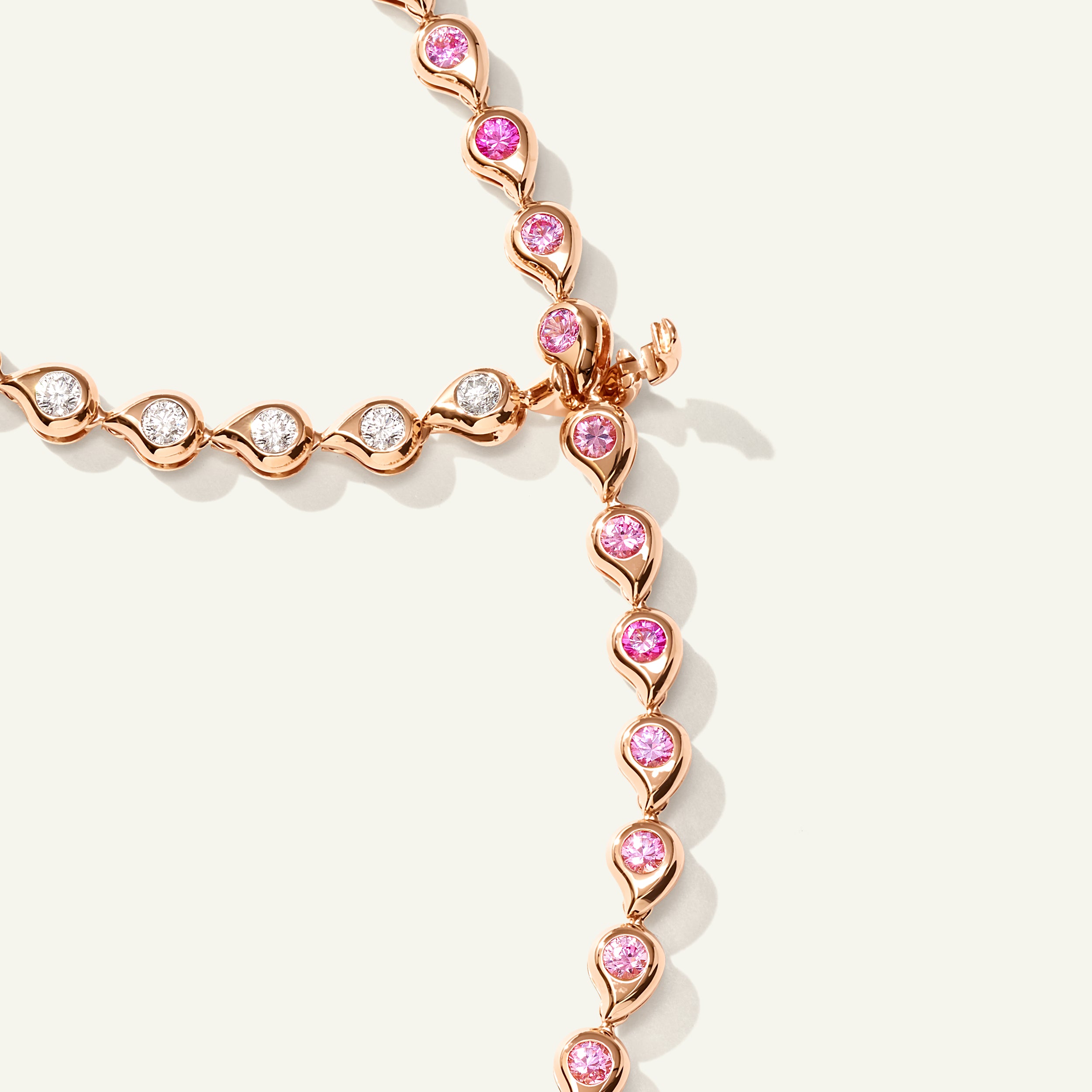 The SNOWFLAKES Rivière Collier Necklace in ‘Blush’ showcases the iconic water drop motif in a radiant sequence of pink sapphires and brilliant white diamonds, set in 18K gold. Gentle movement between each setting evokes the sensation of flowing water along the neckline. The length is adjustable, with a clasp that can be fastened between any of the drops for a perfect fit. A timeless statement, this necklace embodies casual luxury.