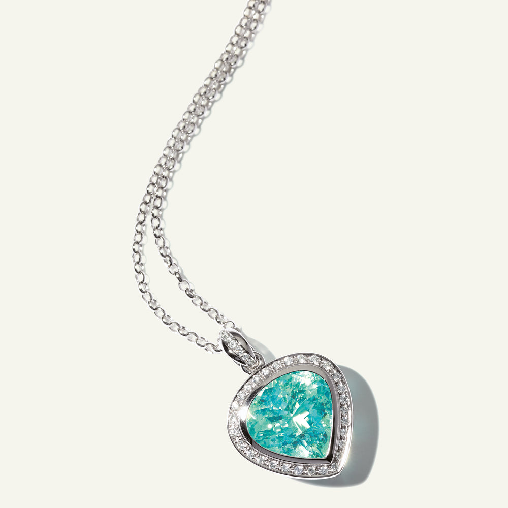 Dieser GLAMOUR Anhänger präsentiert einen seltenen Paraiba Turmalin im Tropfenschliff mit einem leuchtend grünlich-blauen Farbton – ein wahres Sammlerstück. Der Edelstein stammt aus Mosambik und wurde von einem weltweit renommierten Gemmologen geschliffen. Gefasst in 18 Karat Gold mit einem charakteristischen Drop-Design auf der Rückseite und akzentuiert von funkelndem Diamond Pavé.