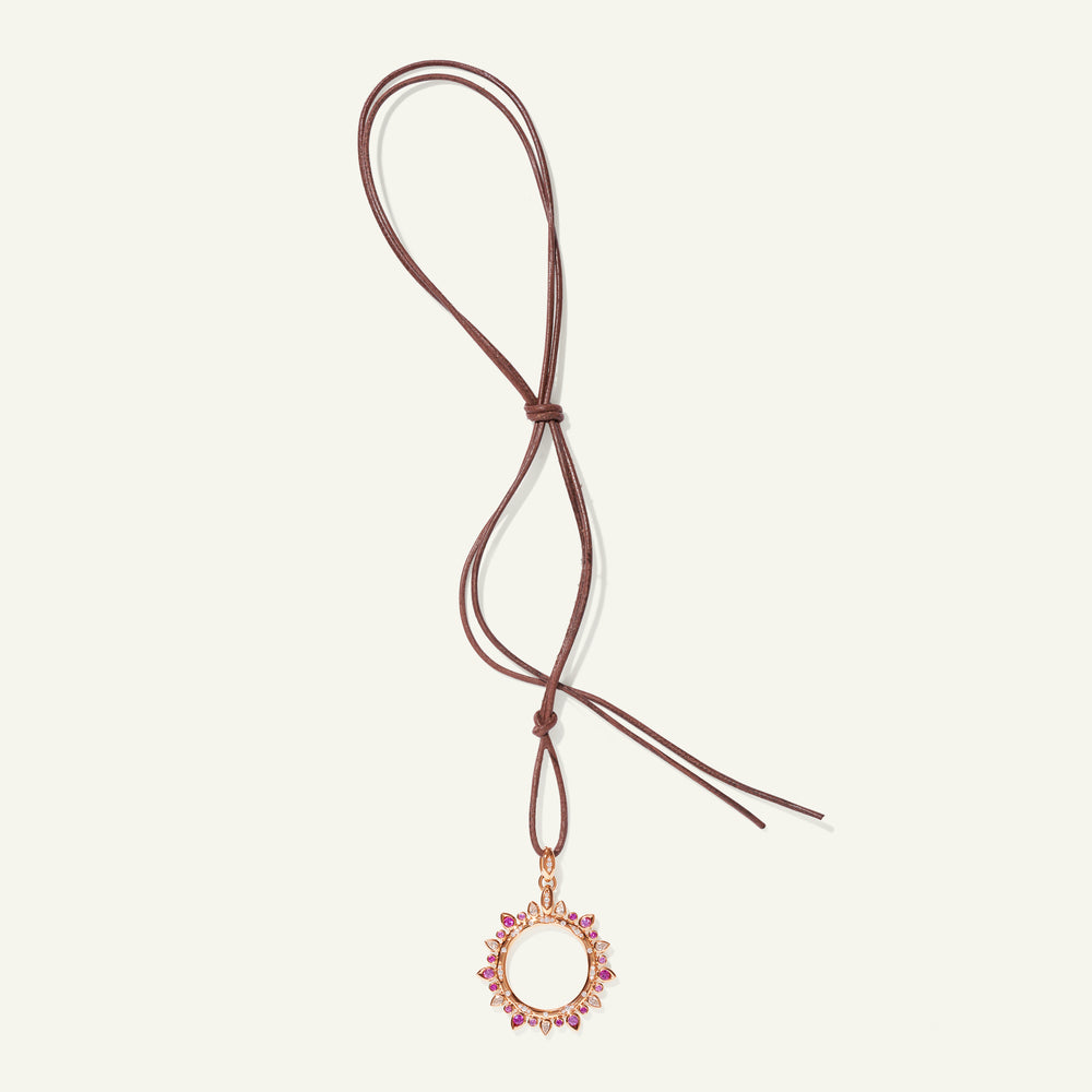 Zart und anmutig verkörpert der GYPSY Large Sun Anhänger in der Color Story 'Blush' pure Eleganz. Eine feine Palette rosafarbener Edelsteine und schimmernder Diamanten ist kunstvoll in einem strahlenden Sonnenanhänger aus 18 Karat Gold arrangiert, der Wärme, Glück und Positivität symbolisiert. Leicht und voller Lebensfreude erstrahlt er mühelos an einem lässigen Lederband oder einer feinen Goldkette.