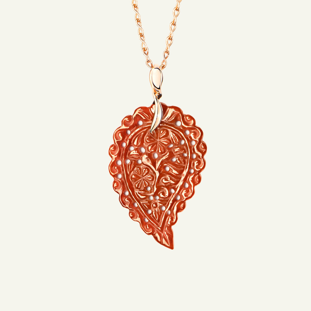 Der INDIA Medium Anhänger aus 18 Karat Gold präsentiert kunstvoll geschnitzten Terra Onyx, dessen warme, erdige Brauntöne in einer eleganten Blattform zur Geltung kommen. Für das zarte Schwingen an einer Kette entworfen, ist er ein wunderschöner Alltagsfavorit, der jedem Look einen Hauch von Raffinesse verleiht – perfekt, um einem Layering-Style zusätzliche Dimension zu geben.