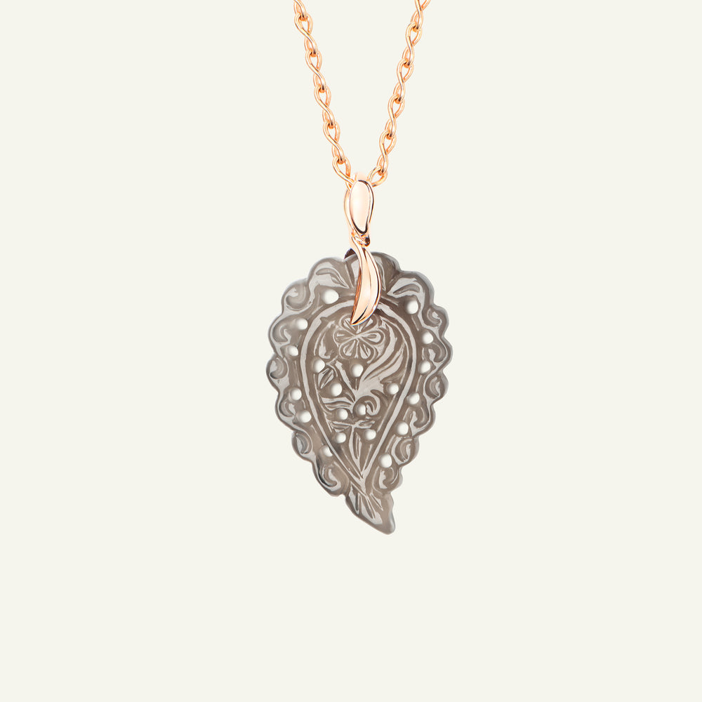 Der INDIA Small Anhänger aus 18 Karat Gold präsentiert kunstvoll geschnitzten grauen Chalcedon, dessen sanfte, durchscheinende Töne in einer eleganten Blattform zur Geltung kommen. Für das zarte Schwingen an einer Kette entworfen, ist er ein vielseitiger Alltagsfavorit, der jedem Look einen Hauch von Raffinesse verleiht – perfekt, um einem Layering-Style zusätzliche Dimension zu geben.