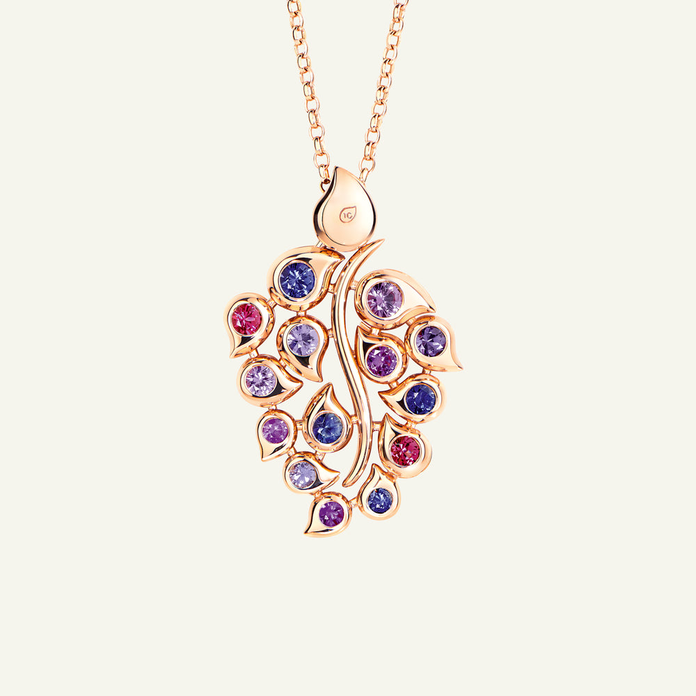 Der SNOWFLAKES Leaf Anhänger in 'Wildberry' strahlt auf der einen Seite leuchtenden Pinktönen, tiefem Violett und satten Beerennuancen und auf der anderen mit funkelnden weißen Diamanten, jeweils gefasst in 18 Karat Gold. Getragen an einer langen Kette oder einem lässigen Lederband, ist dieser Anhänger vielseitig einsetzbar – eine elegante Wahl für alltäglichen Luxus ebenso wie für besondere Anlässe.