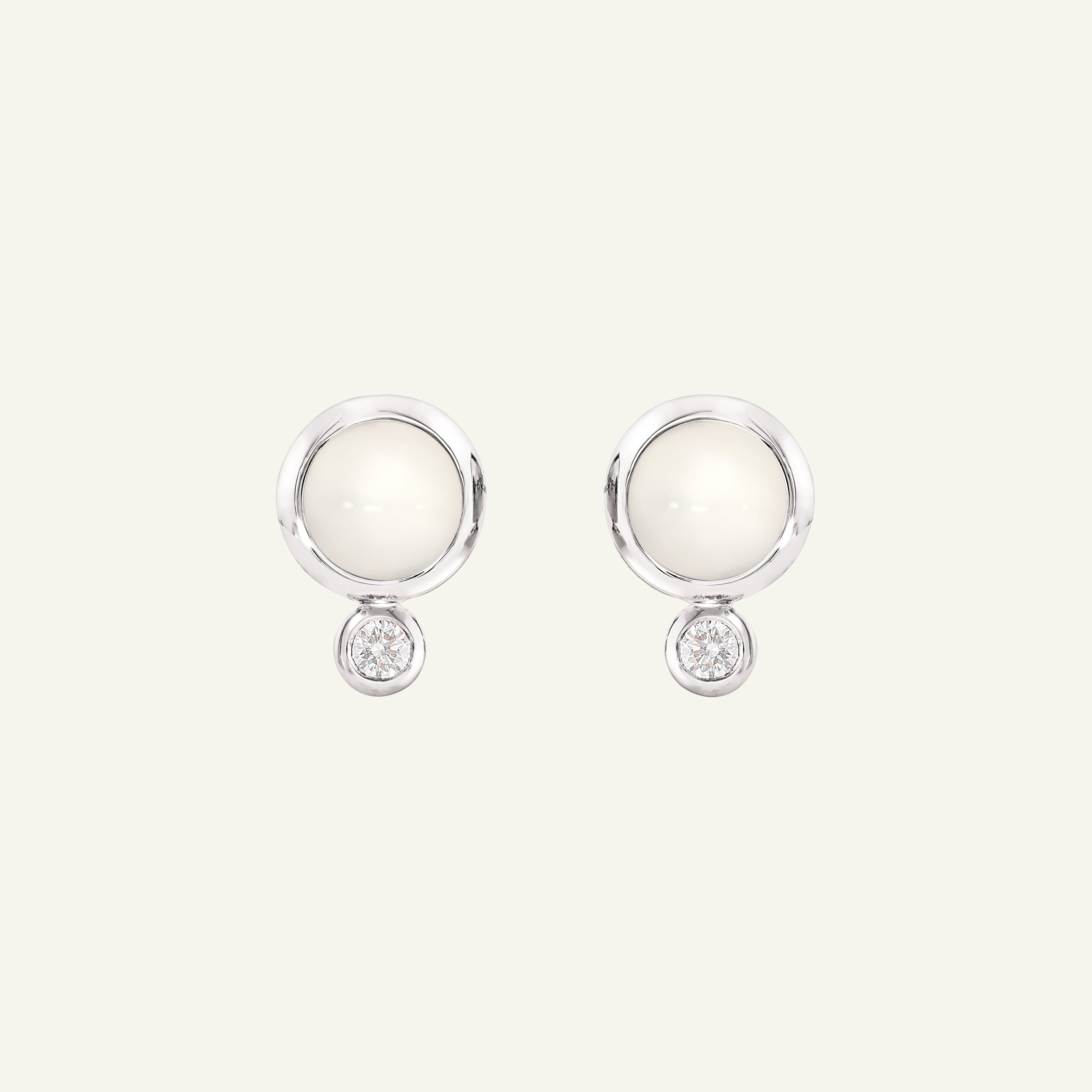 Die BOUTON Ohrringe aus 18 Karat Gold präsentieren leuchtende Edelsteine in Weißtönen, kombiniert mit einem Hauch funkelnder weißer Diamanten. Für vielseitiges Styling entworfen, können sie wahlweise mit dem Diamanten nach unten schwingend oder entlang des Ohrs getragen werden. Ein komfortables, klassisches Accessoire, das sich perfekt für den Alltag eignet.
