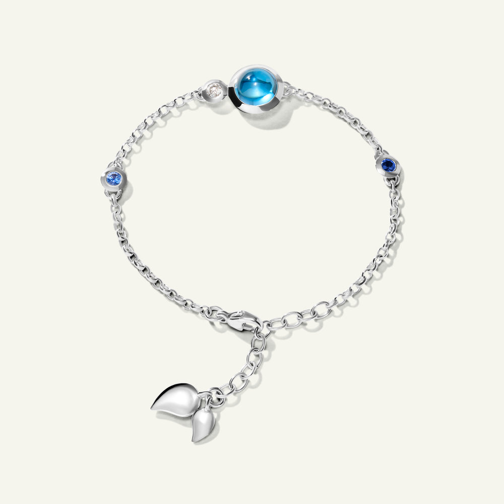 Das BOUTON Mini Chain Armband in 'Ocean' zelebriert die Tiefen des Meeres mit leuchtenden Blautönen mit einer verspielten Kombination aus Edelsteinen im Cabochon-Schliff und zarten Wassertropfen-Details in 18 Karat Gold. Ausdrucksstark und zugleich raffiniert passt es an jedes Handgelenk und entfaltet solo getragen ebenso seine Wirkung wie im Layering für ein noch markanteres Statement. Ein vielseitiges Schmuckstück, das jeder Kollektion lebendige Farbe und mühelosen Charme verleiht.