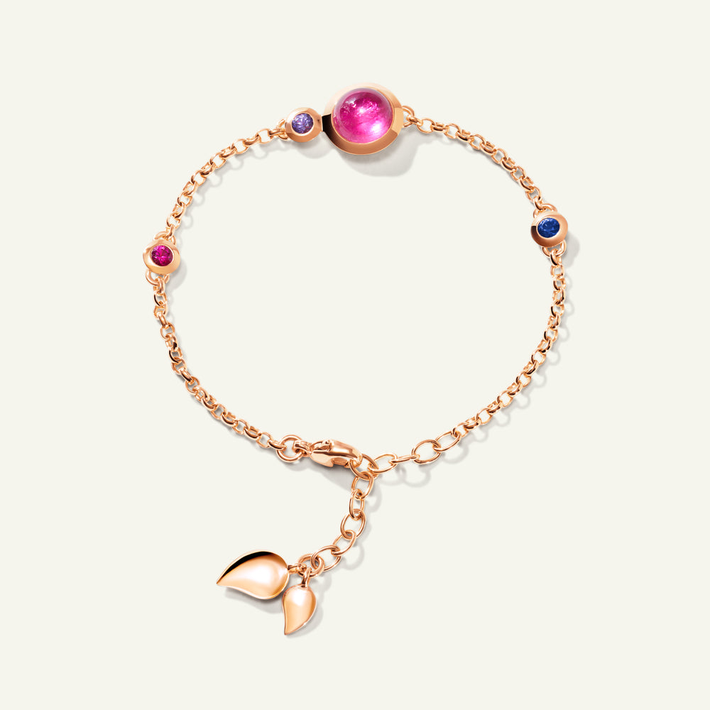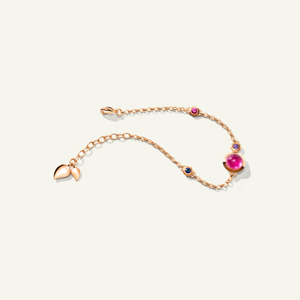 Das BOUTON Mini Chain Armband in 'Wildberry' zelebriert satte, fruchtige Farbtöne mit einer verspielten Kombination aus Edelsteinen im Cabochon-Schliff und zarten Wassertropfen-Details in 18 Karat Gold. Ausdrucksstark und zugleich raffiniert passt es an jedes Handgelenk und entfaltet solo getragen ebenso seine Wirkung wie im Layering für ein noch markanteres Statement. Ein vielseitiges Schmuckstück, das jeder Kollektion lebendige Farbe und mühelosen Charme verleiht.