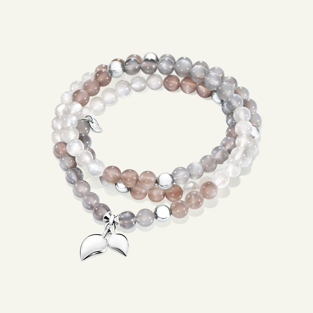 Das INDIA Medium Armband in der Color Story 'Camel' besteht aus Mondsteinen in sanften, kühlen Naturtönen von Braun, Grau und Weiß, akzentuiert durch Elemente aus 18 Karat Gold und zwei bewegliche Drop Charms. Auf elastischem Band aufgezogen, überzeugt dieses dreifach gewickelte Design mit höchstem Tragekomfort und lässt sich auch als Halskette tragen – für vielseitigen Stil und natürliche Eleganz.