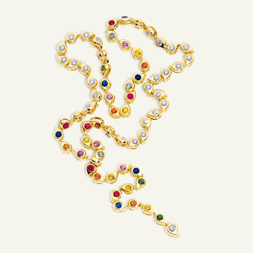 Das SNOWFLAKES Rivière Collier in 'Candy' präsentiert das ikonische Wassertropfen-Motiv in einer verspielten Abfolge aus bunten Edelsteinen und funkelnden weißen Diamanten