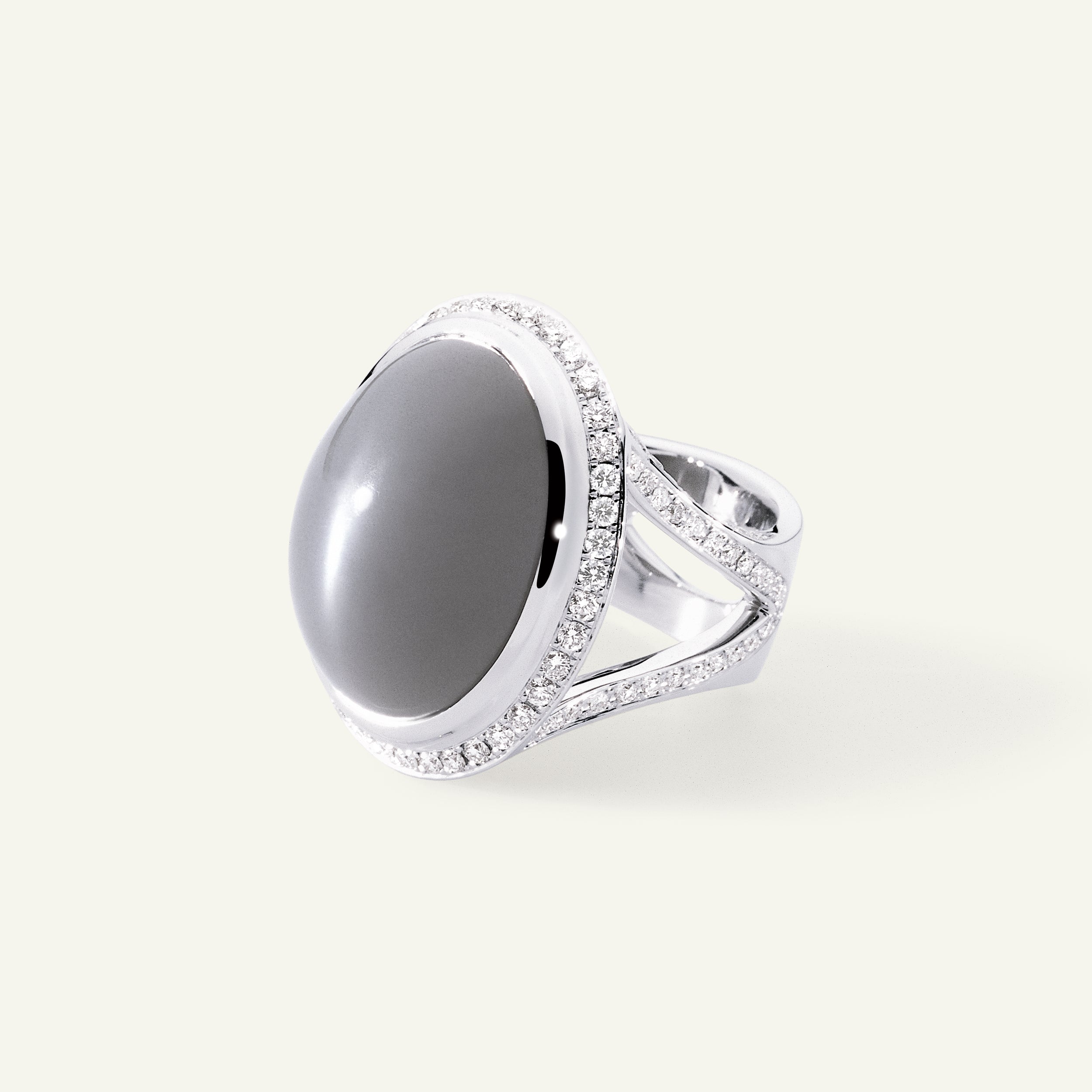Der CUSHION Large Ring präsentiert einen Grauen Mondstein im Cabochon-Schliff mit geheimnisvollem, rauchigem Schimmer. Diamond Pavé rahmt diesen markanten Cocktailring aus 18 Karat Gold ein. Ausdrucksstark und zugleich zeitlos verkörpert das Design mühelose Eleganz und höchsten Tragekomfort für jeden Tag.