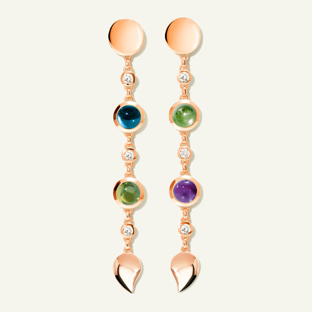 Die BOUTON Long Ohrringe aus 18 Karat Gold zeigen die Schönheit der Color Story 'Aurora' und vereinen im Cabochon-Schliff gearbeitete Edelsteine in leuchtendem Violett und frischem Grün mit funkelnden weißen Diamanten. Für anmutige Bewegung entworfen, entfalten diese ausdrucksstarken Ohrringe ein farbenprächtiges Spiel entlang des Ohrs. Ein zartes Wassertropfen-Detail vollendet das Design und unterstreicht die feminine Eleganz dieses Statement Pieces.