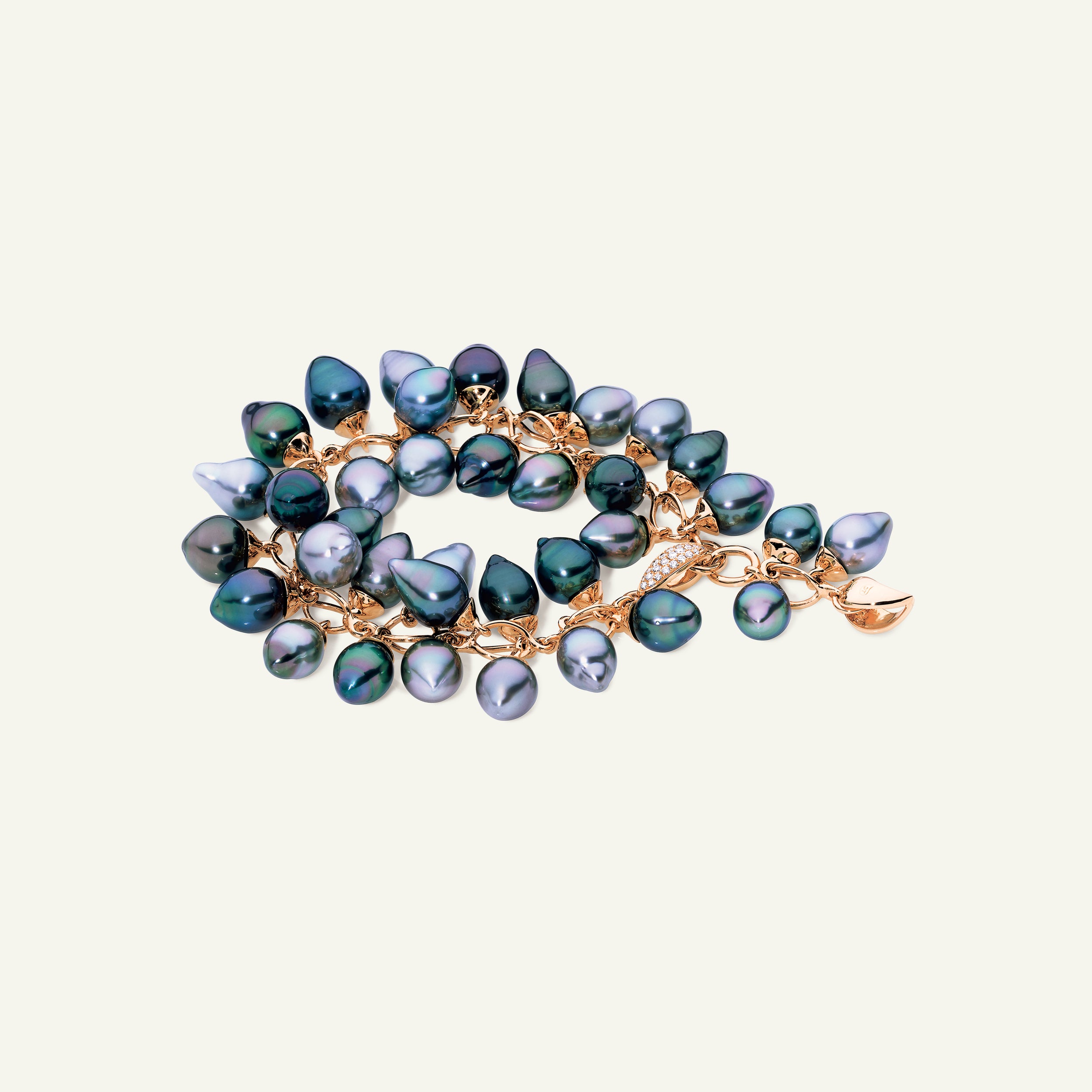 Das GRAPES Armband aus 18 Karat Gold präsentiert natürliche Tahiti-Perlen in faszinierenden Nuancen, die von sanften Silbertönen bis zu tiefen Pfauenfarben reichen. Jede Perle zeigt ihre ganz eigene Form und ihren individuellen Lüster. Dank der verstellbaren Größe passt sich das Armband jedem Handgelenk an und wird von einer diamantbesetzten Schließe vollendet. Ein lebendiges Schmuckstück mit elegant-modernem Twist.