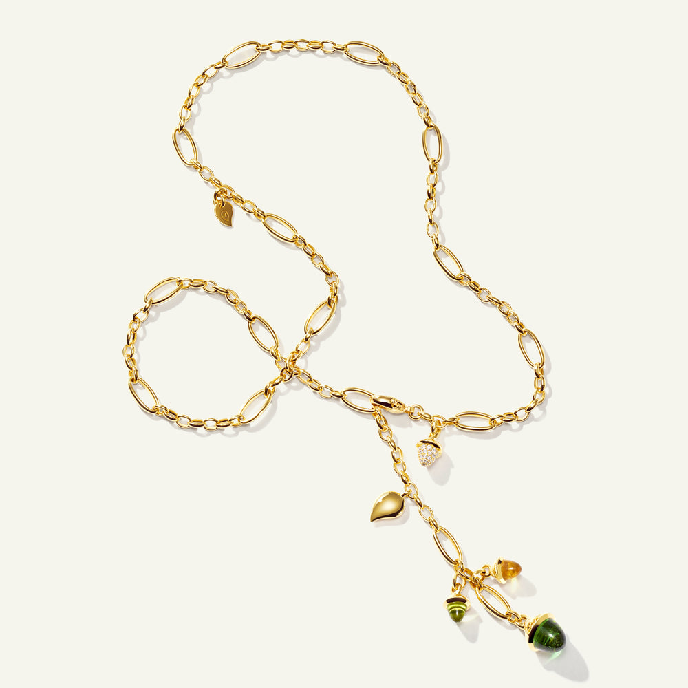 Die MIKADO Delicate Halskette in 'Rainforest' vereint kegelförmige Anhänger in leuchtenden Grüntönen. Zarte Wassertropfen-Details und ein funkelnder Diamond Pavé Anhänger vollenden die handgefertigte Kette aus 18 Karat Gold. Durch ihre variable Länge ist sie ein vielseitiges Schmuckstück für jeden Anlass.