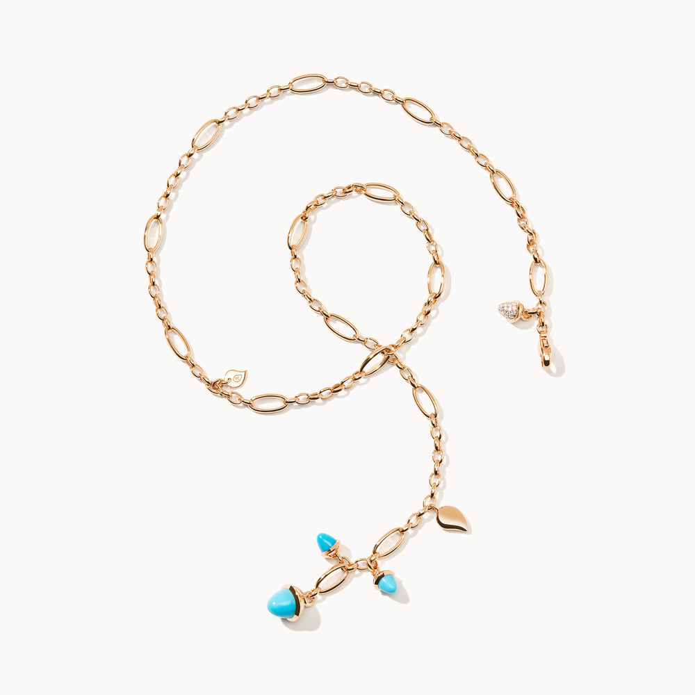 Die MIKADO Delicate Halskette in 'Turqoise' vereint kegelförmige Anhänger in leuchtenden Blau-Grün-Tönen. Zarte Wassertropfen-Details und ein funkelnder Diamond Pavé Anhänger vollenden die handgefertigte Kette aus 18 Karat Gold. Durch ihre variable Länge ist sie ein vielseitiges Schmuckstück für jeden Anlass.