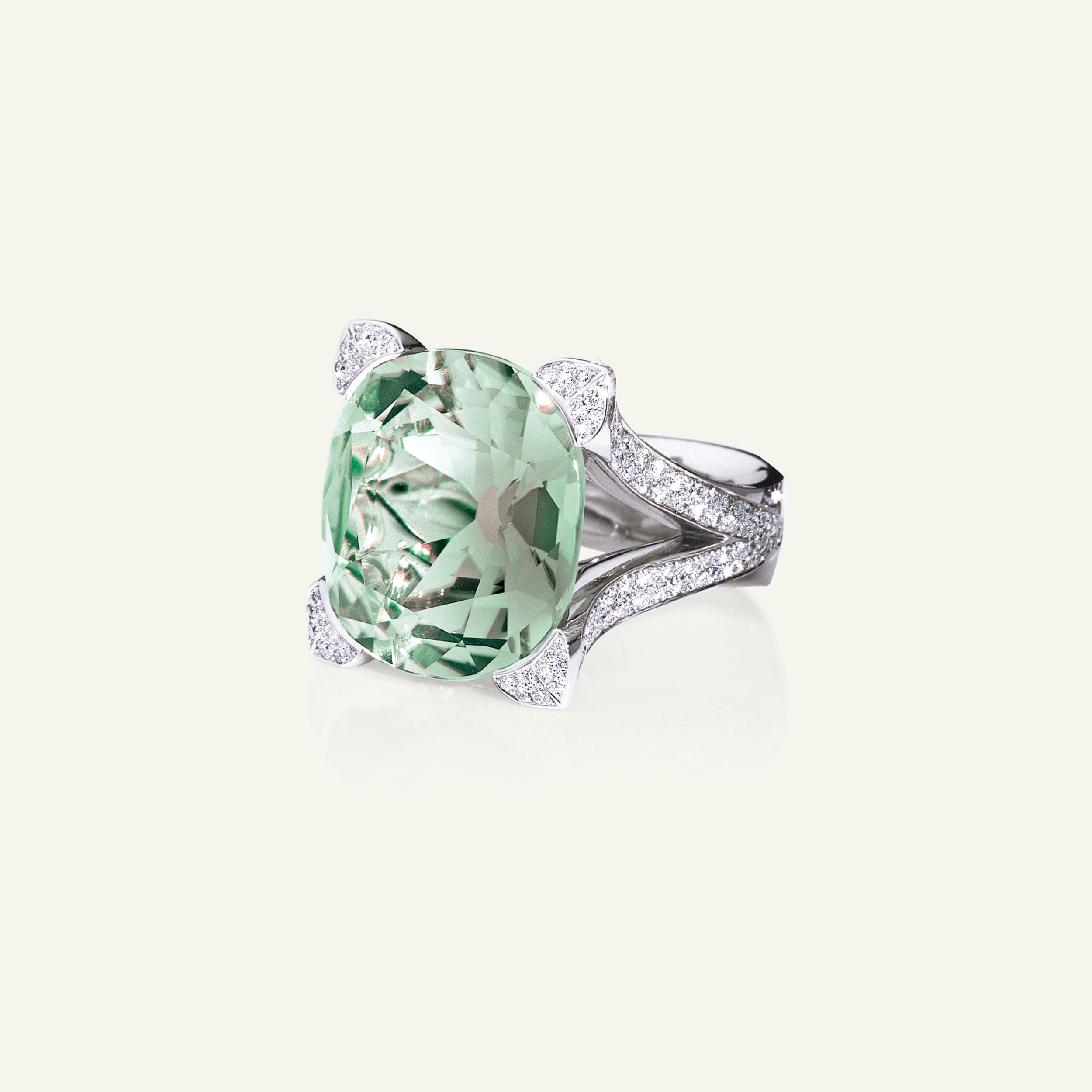 Mit einem 25,58 ct Tourmalin in antiker Form mit zart bläulich-grünem Schimmer sowie rund 1,85 ct Diamant-Pavé in feiner Qualität (F/vs).