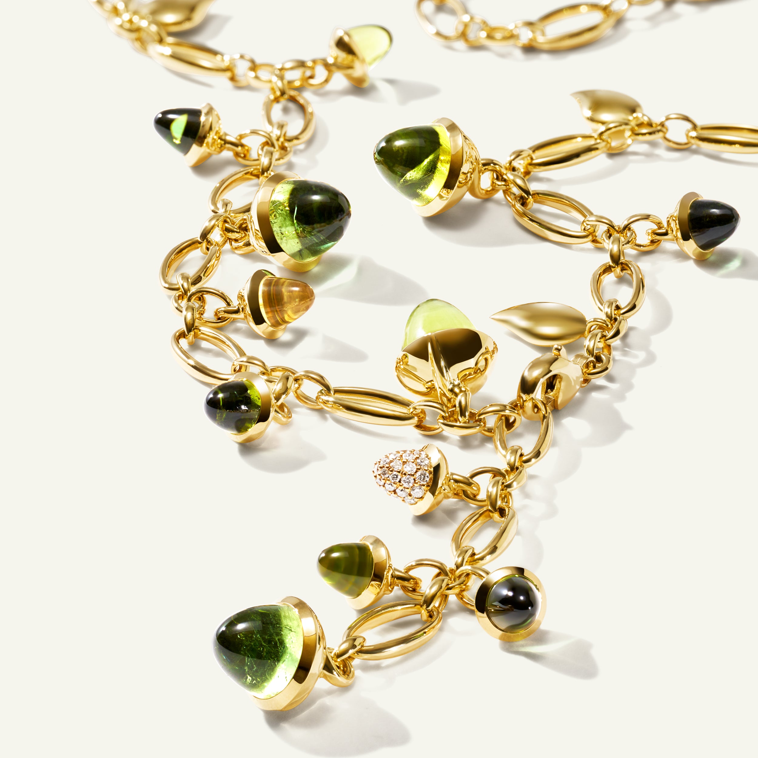 3x Peridot (je ca. 1,05cts), 5x grüner Turmalin (je ca. 1,0ct), 2x Lemon Quartz (je ca. 0,9ct) und 1x Diamant Pavé (ca. 0,22ct, G/si)