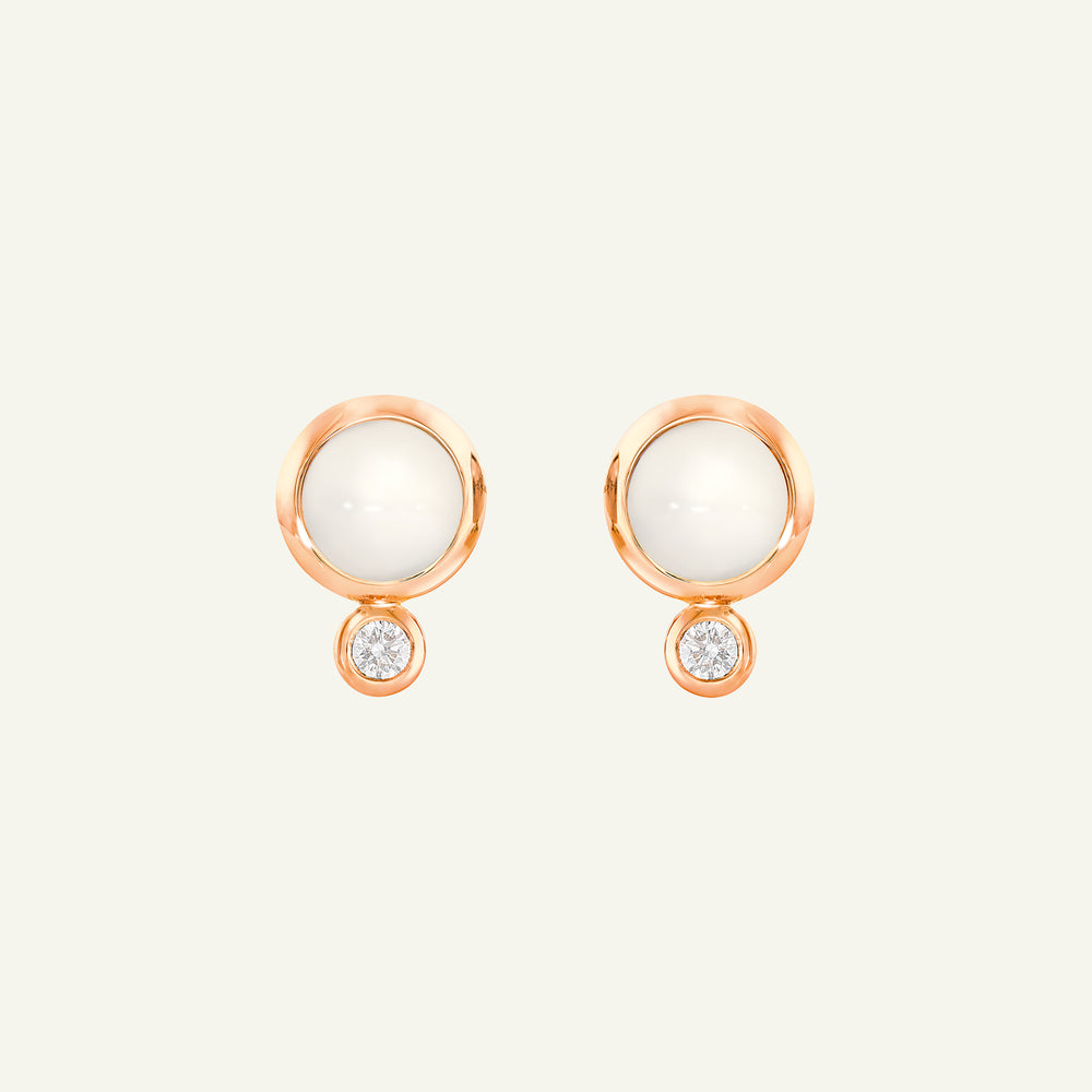 Die BOUTON Ohrringe aus 18 Karat Gold präsentieren leuchtende Edelsteine in Weißtönen, kombiniert mit einem Hauch funkelnder weißer Diamanten. Für vielseitiges Styling entworfen, können sie wahlweise mit dem Diamanten nach unten schwingend oder entlang des Ohrs getragen werden. Ein komfortables, klassisches Accessoire, das sich perfekt für den Alltag eignet.