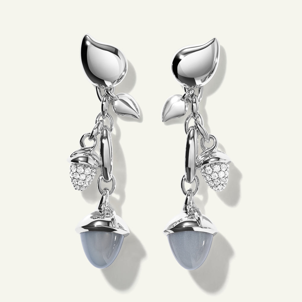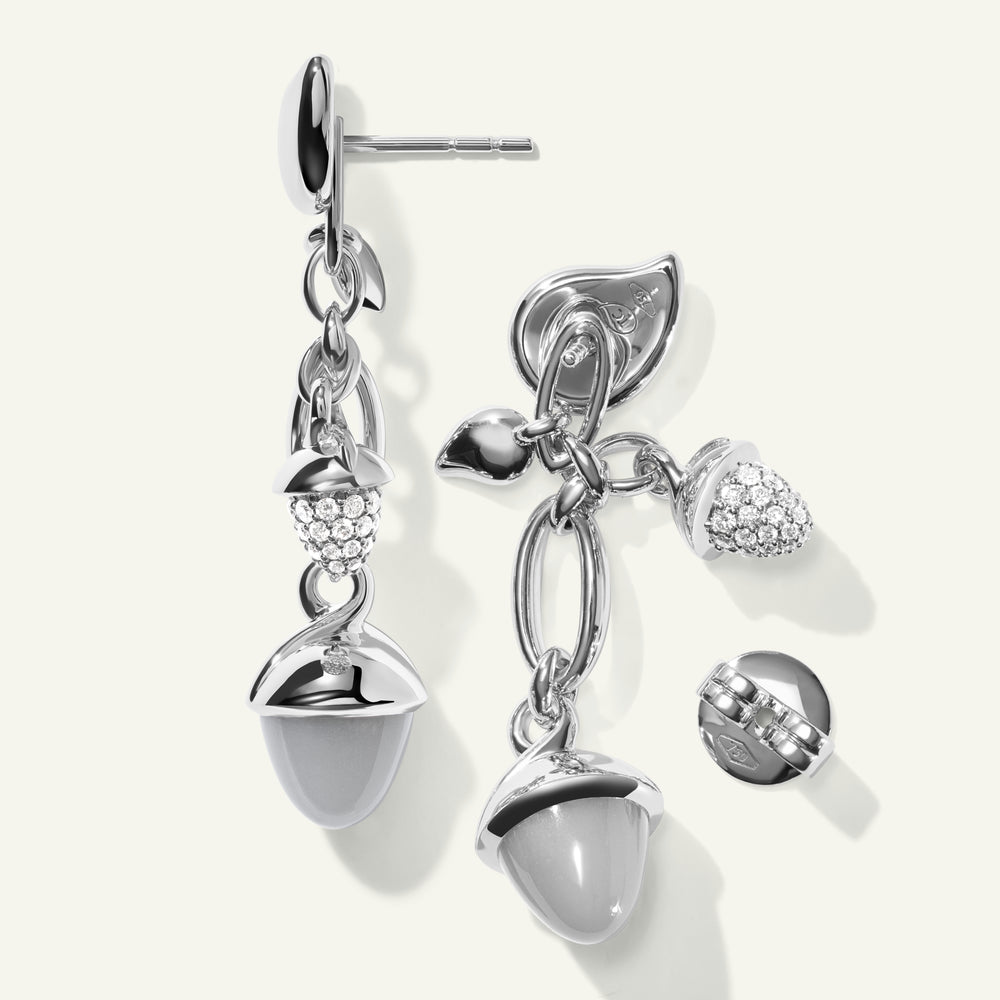 Eine Hommage an die Individualität: Die MIKADO Dangling 2 Acorn Ohrringe lassen sich wahlweise als elegante Hänger, stilvolle Stecker oder als Anhänger an einer Kette tragen. In aufwendiger Handarbeit aus 18 Karat Gold gefertigt, verleihen die charakteristischen Wassertropfen-Details dem Design eine unverwechselbare Signatur. Die elegante Color Story 'Cashmere' kombiniert leuchtende Mondsteine in sanften Neutraltönen mit Diamant Pavé zu einem Look, der anmutig und gleichzeitig mühelos schick wirkt.
