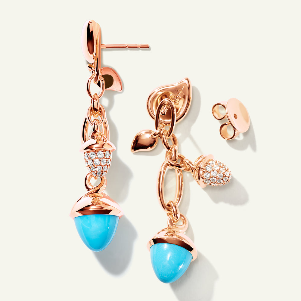 Eine Hommage an die Individualität: Die MIKADO Dangling 2 Acorn Ohrringe lassen sich wahlweise als elegante Hänger, stilvolle Stecker oder als Anhänger an einer Kette tragen. In aufwendiger Handarbeit aus 18 Karat Gold gefertigt, verleihen die charakteristischen Wassertropfen-Details dem Design eine unverwechselbare Signatur. Die belebende Color Story 'Turquoise' kombiniert leuchtende Blau-Grün-Töne mit Diamant Pavé zu einem Look, der strahlend, modern und gleichzeitig mühelos schick wirkt.