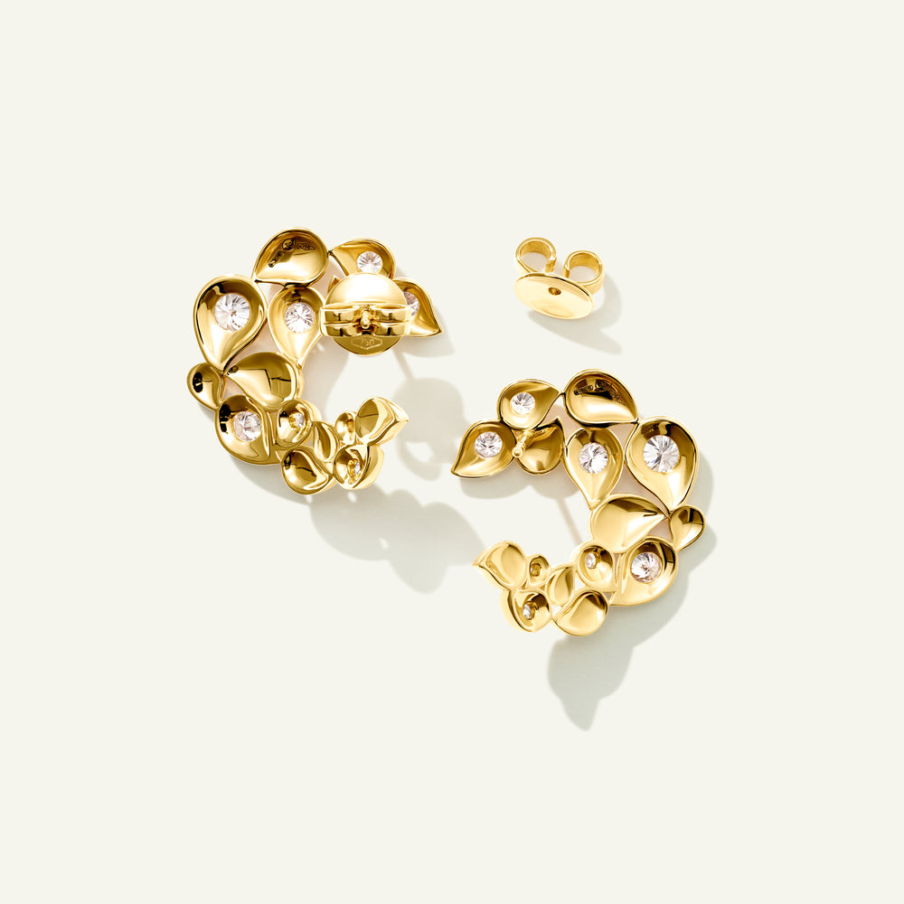 Ganz im romantischen Geist der SNOWFLAKES Kollektion präsentieren diese kunstvollen Ohrringe das ikonische Wassertropfen-Motiv in einer Abfolge aus poliertem 18 Karat Gold und funkelnden weißen Diamanten. Mit ihrer gedrehten Creolen-Silhouette schmiegen sie sich sanft hinter das Ohrläppchen und formen einen eleganten Kreis