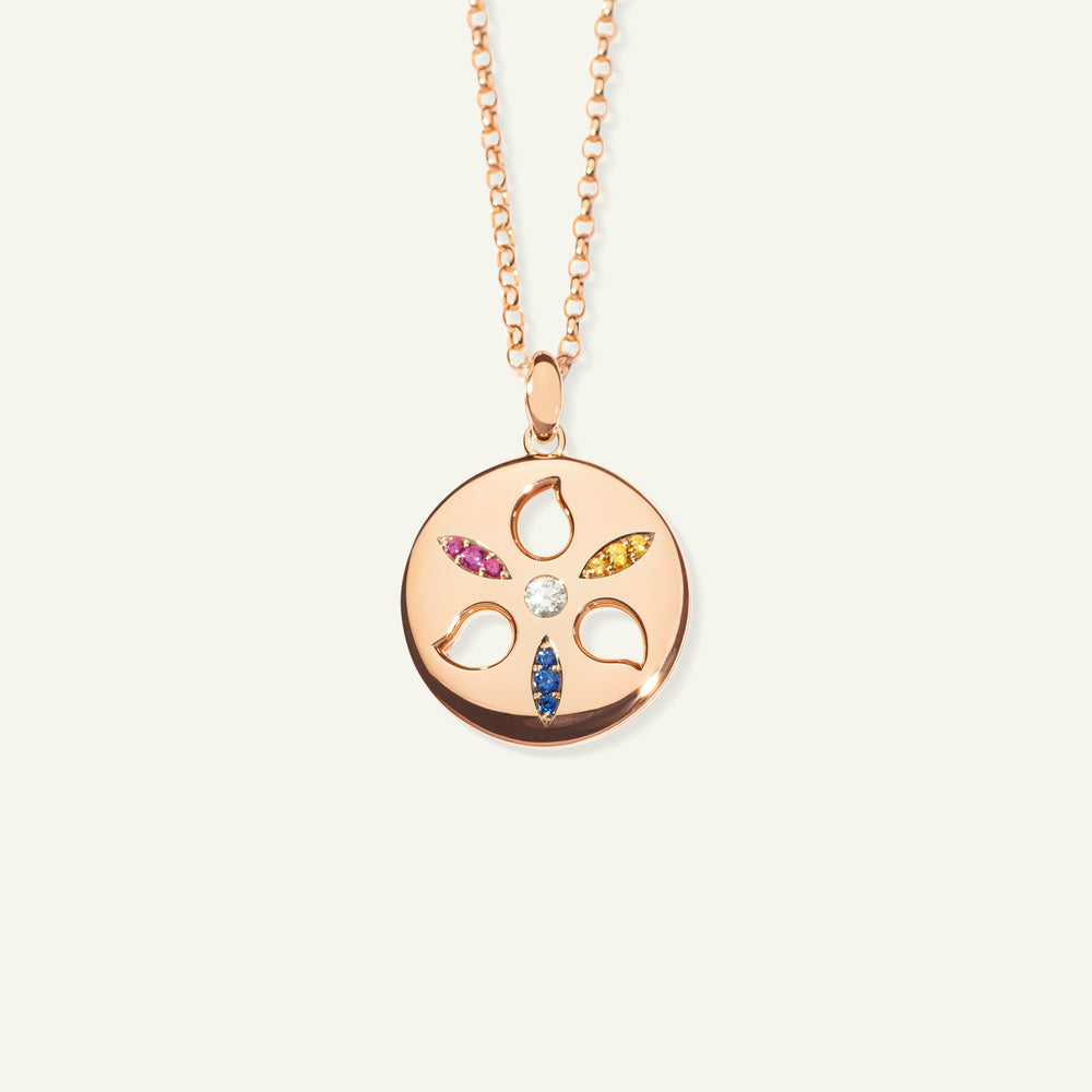Der SAND DOLLAR Large Anhänger ist inspiriert von der Schönheit des gleichnamigen Seeigels und symbolisiert die tiefe Verbundenheit von TAMARA COMOLLI mit dem Ozean. Strahlende Saphire in Rosa-, Blau- und Gelbtönen umrahmen einen funkelnden weißen Diamanten, gefasst in 18 Karat Gold.