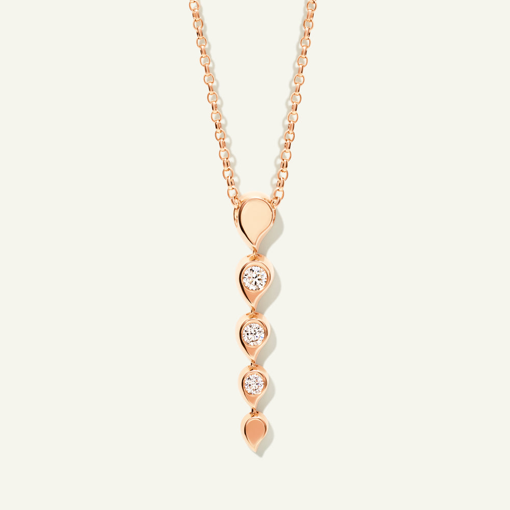 Ganz im romantischen Geist der SNOWFLAKES Kollektion präsentiert der Rivière Anhänger ikonische Wassertropfen-Formen aus poliertem 18 Karat Gold, jeweils besetzt mit funkelnden weißen Diamanten. Durch die sanfte Beweglichkeit zwischen den Fassungen entsteht die Anmutung fließenden Wassers, während das Licht eingefangen wird – ein beeindruckendes Schmuckstück, in dem moderne Handwerkskunst auf zeitlose Raffinesse trifft.