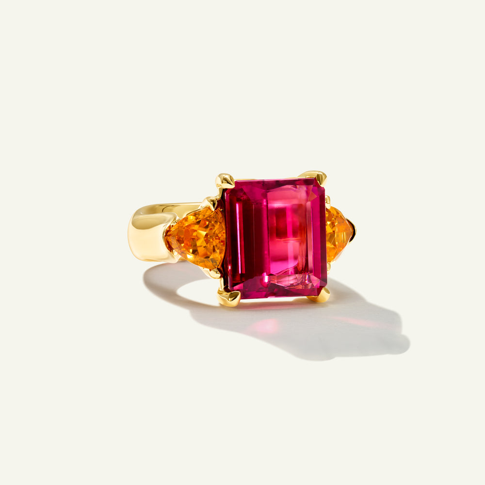 Der warm strahlende Rubellit auf diesem GLAMOUR Ring – ein neu interpretiertes Design aus dem Archiv von TAMARA COMOLLI – wird von zwei Mandarin Granaten im Trilliant-Schliff eingerahmt und in 18 Karat Gelbgold gefasst. Das Ergebnis ist ein ausdrucksstarkes Farbenspiel, das in jedem Licht seine Strahlkraft entfaltet. Dieses Schmuckstück ist weit mehr als ein Ring – es ist ein Kunstwerk voller Raffinesse und Eleganz.