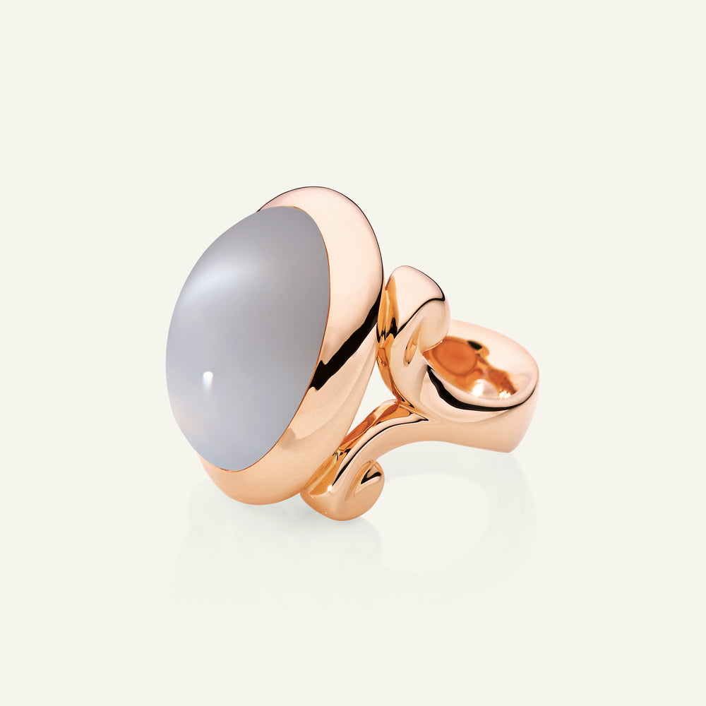 Der HIPPIE GLAM Large Ring präsentiert einen Grauen Mondstein im Cabochon-Schliff, gefasst in 18 Karat Gold. Seine organische Form verleiht eine lässige Eleganz. Vielseitig kombinierbar, lässt sich dieser Ring im Stack mit anderen tragen oder solo als modernes Statement inszenieren.