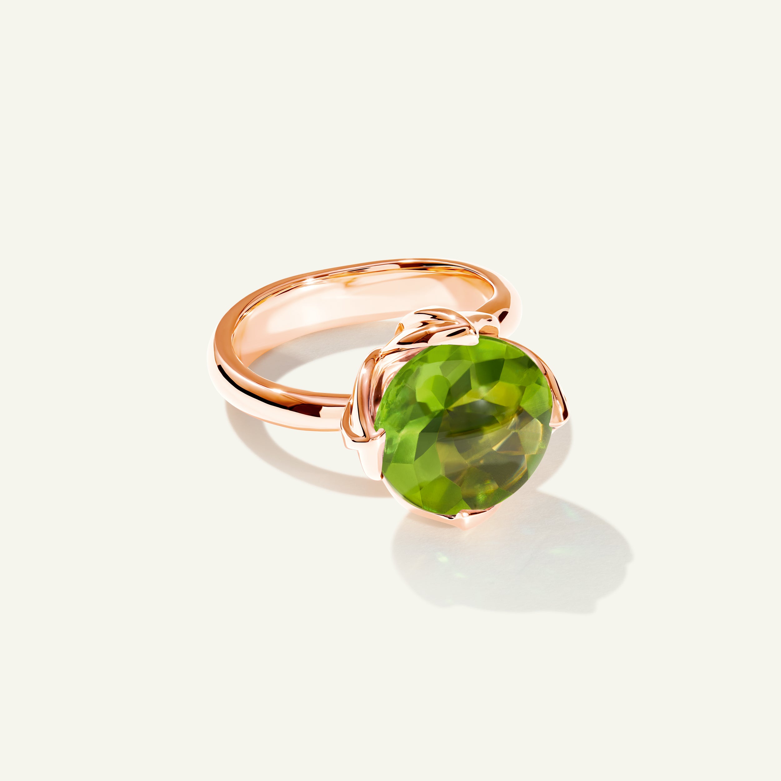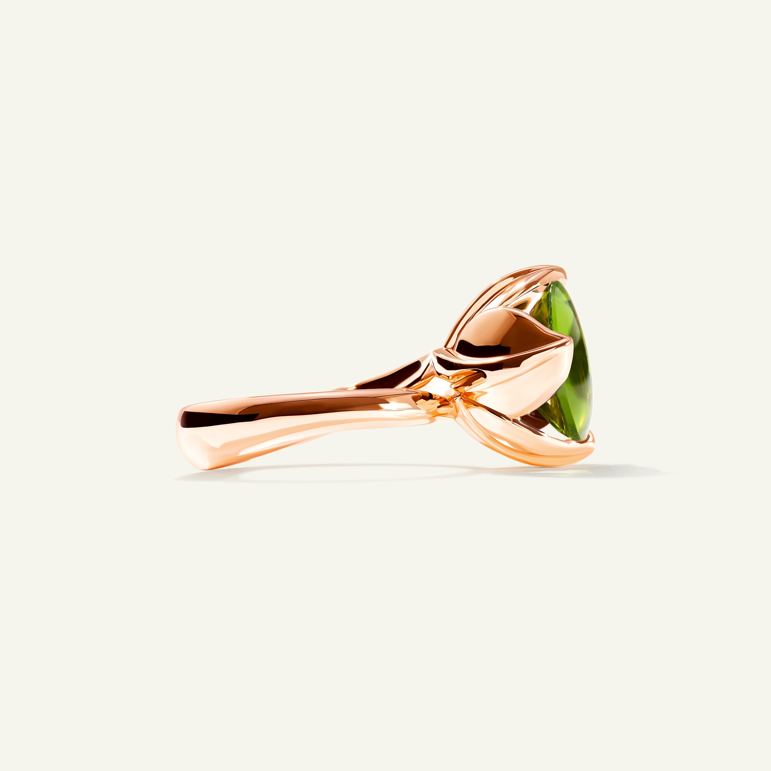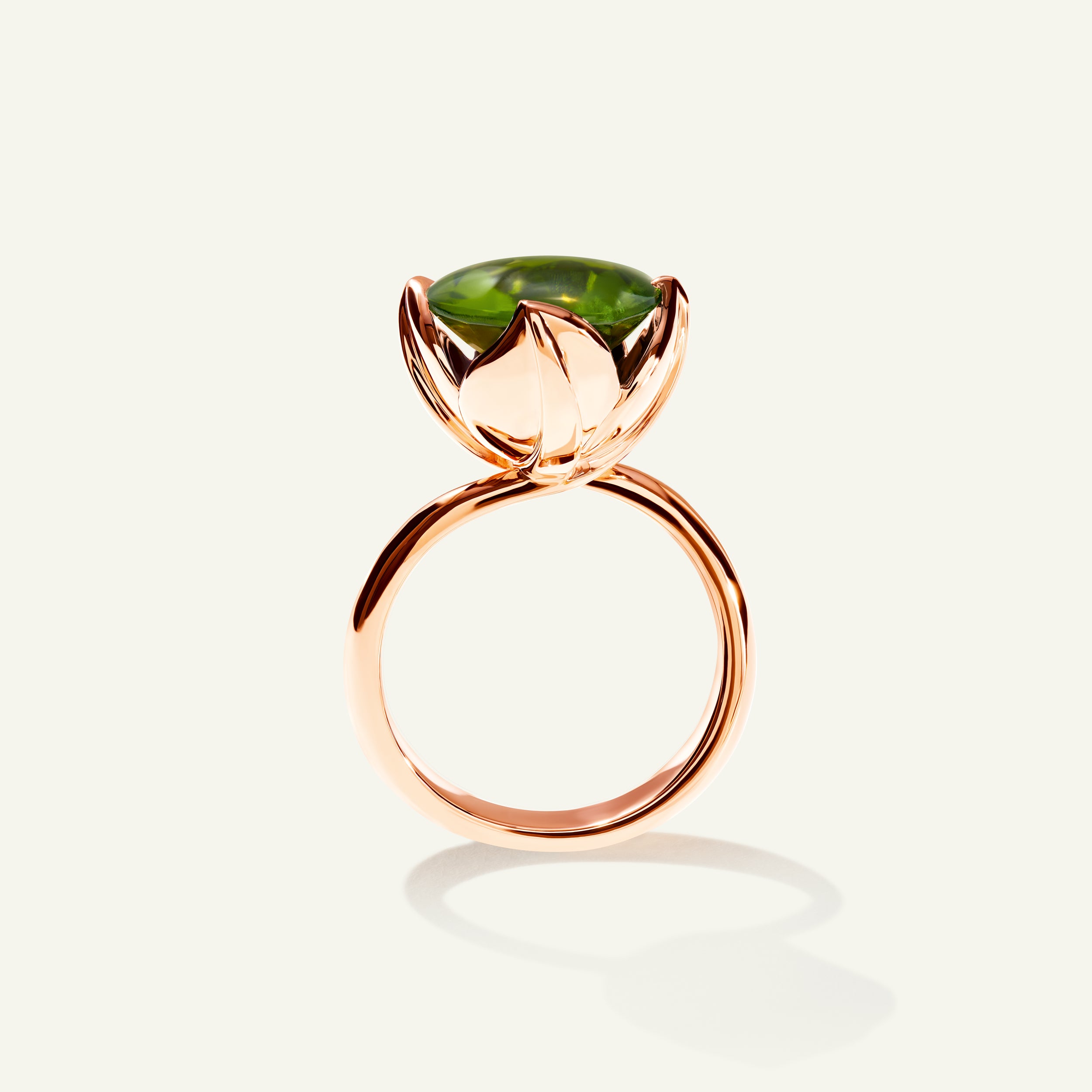 Der TULIP Large Ring präsentiert einen leuchtend grünen Peridot als Mittelstein, der von einer filigranen Krappenfassung getragen und von vier kunstvoll geformten Tulpenblättern umrahmt wird. Die Ringschiene aus 18 Karat Gold schmiegt sich elegant um den Finger – entworfen, um solo getragen oder mit weiteren TULIP Ringen kombiniert zu werden und so einen unverwechselbaren Signature-Look zu kreieren.