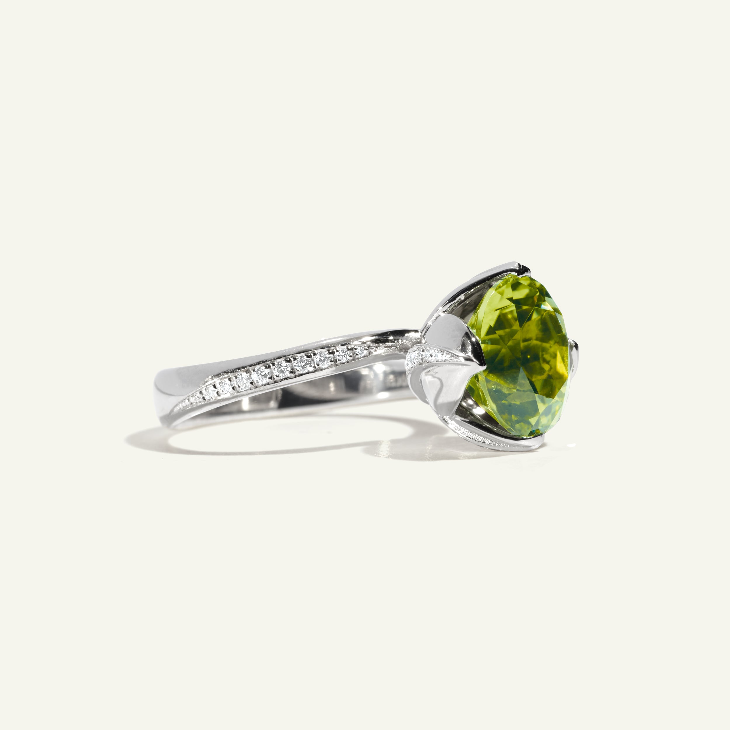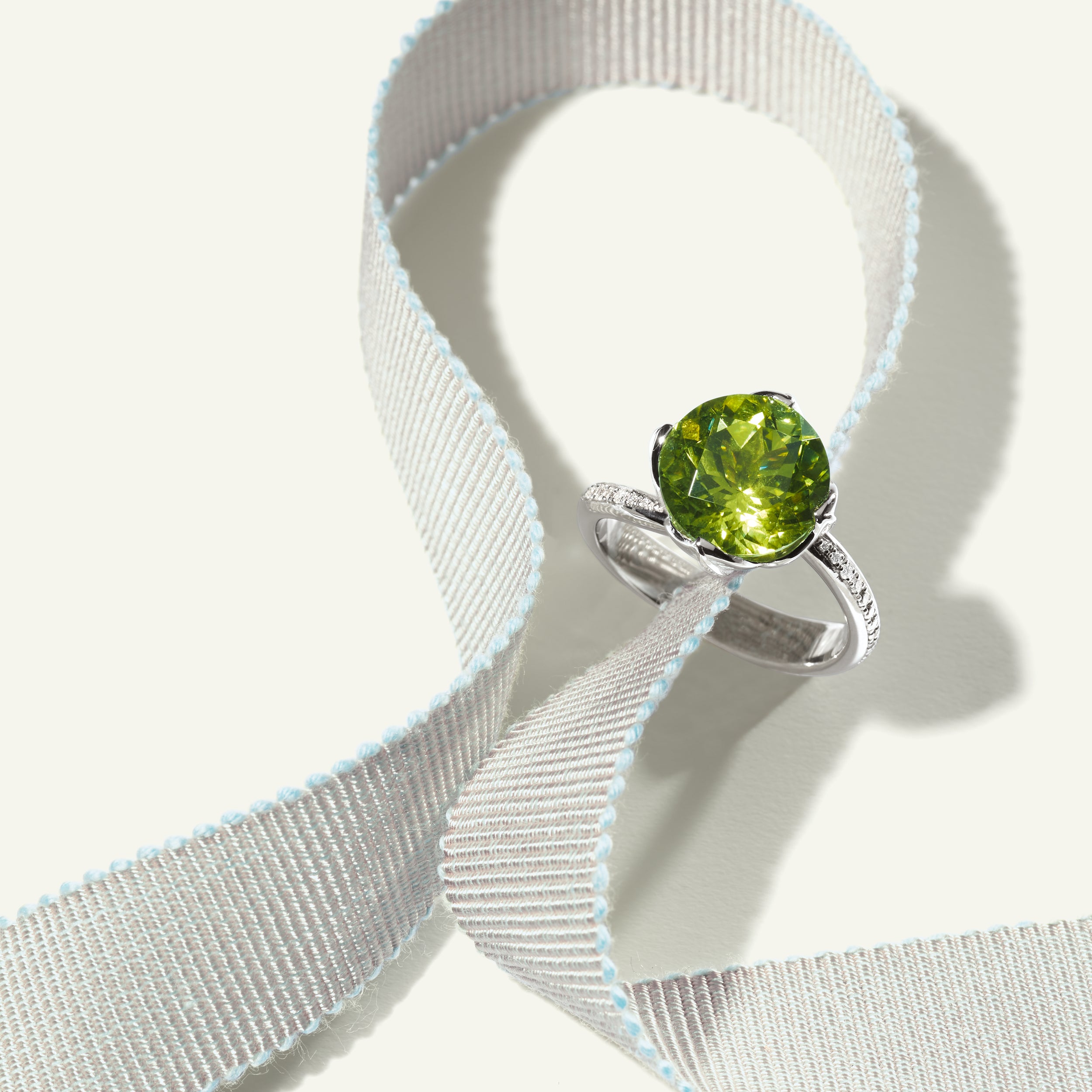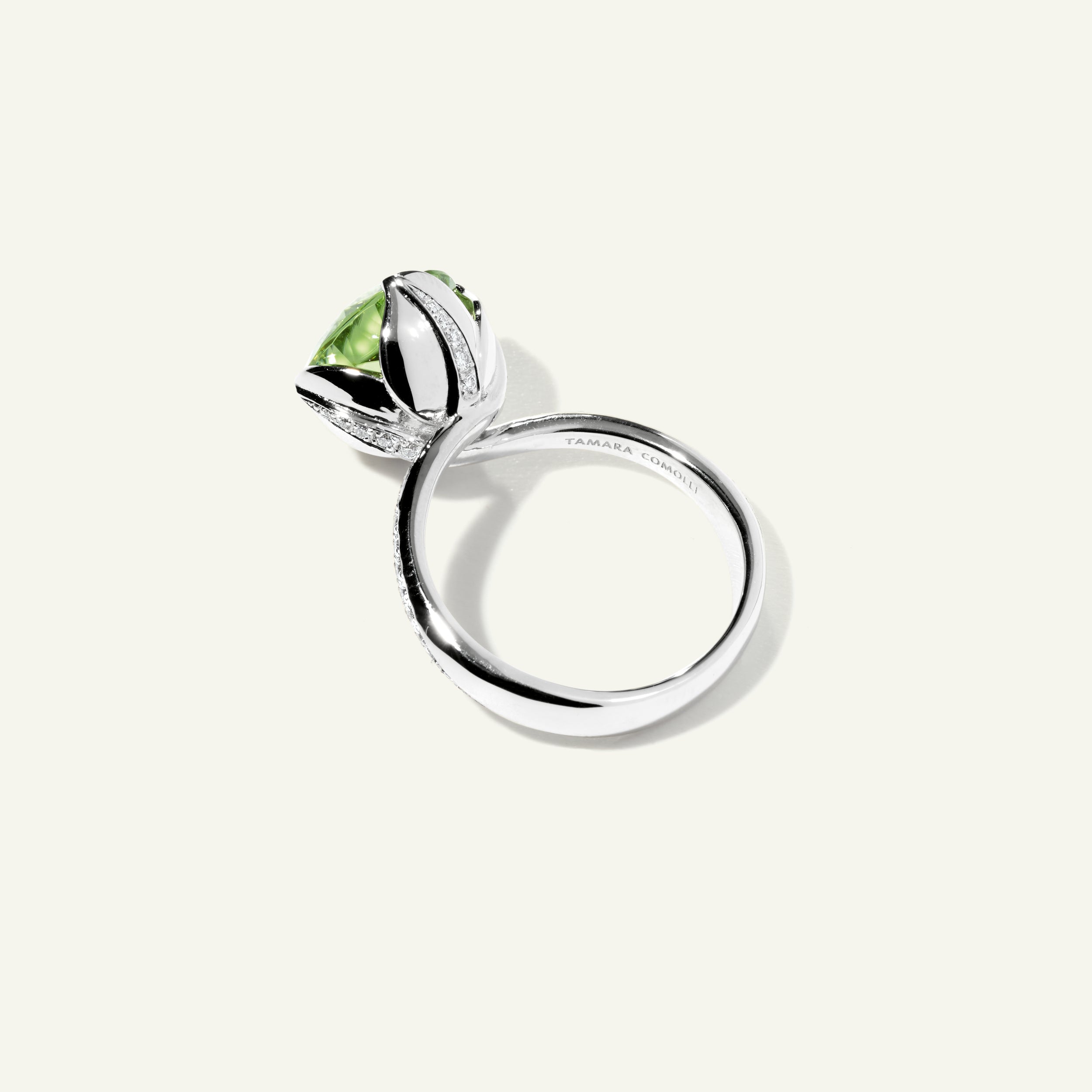 Durch sein feminines Design bestechend setzt unser TULIP Ring einen wunderschönen mint Turmalin gekonnt in Szene. Die feine Diamant Pavé Linie lässt die Facetten dieses seltenen, farbintensiven Edelsteins aus allen Winkeln strahlen.